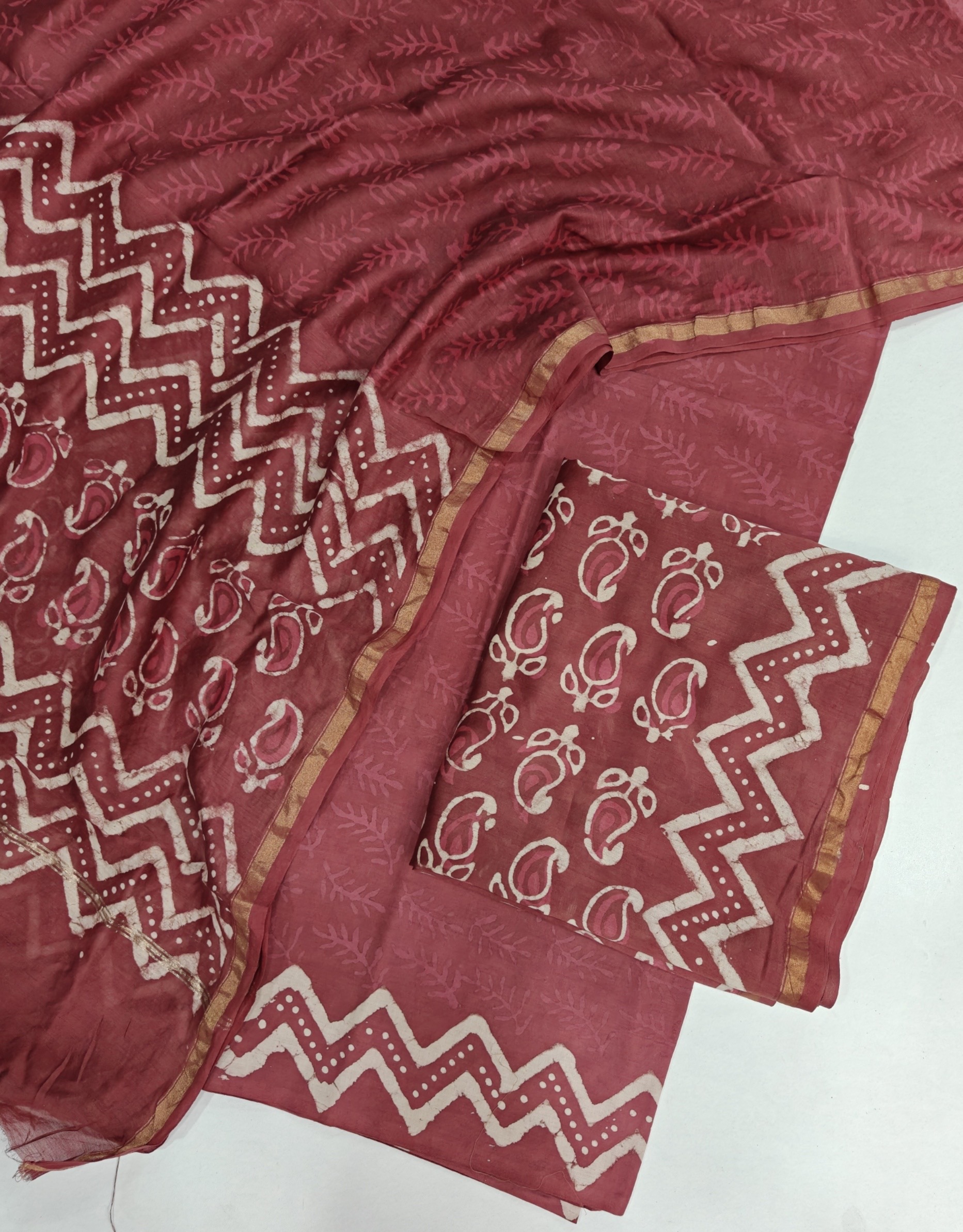 Exclusive chanderi silk suit set with *Cotton* pajama and pure chanderi silk dupatta Top-2.5 mtr.(chanderi silk) Dupatta -2.5 mtr(chanderi silk) Salwar -2.5 mtr(Cotton)