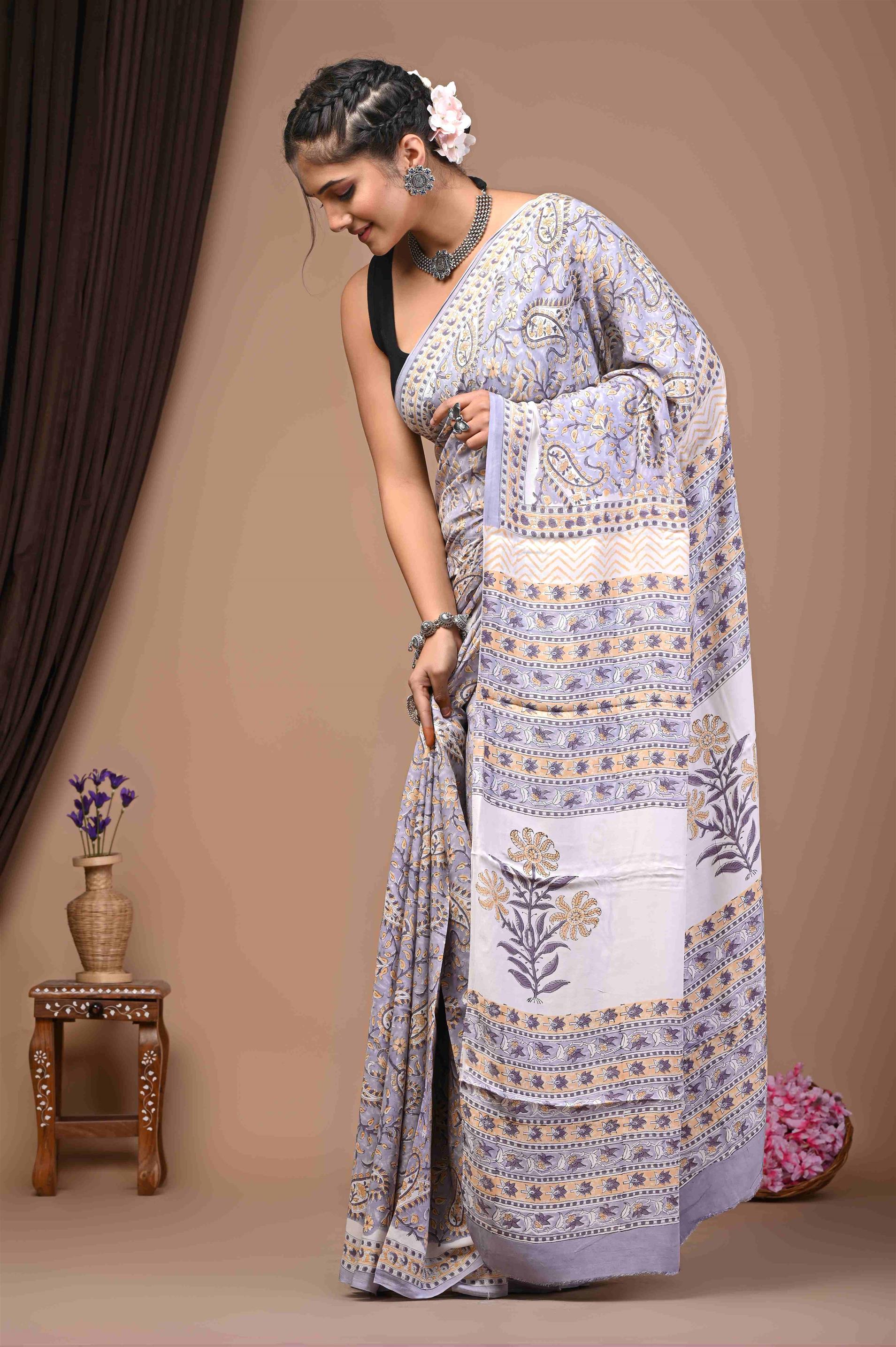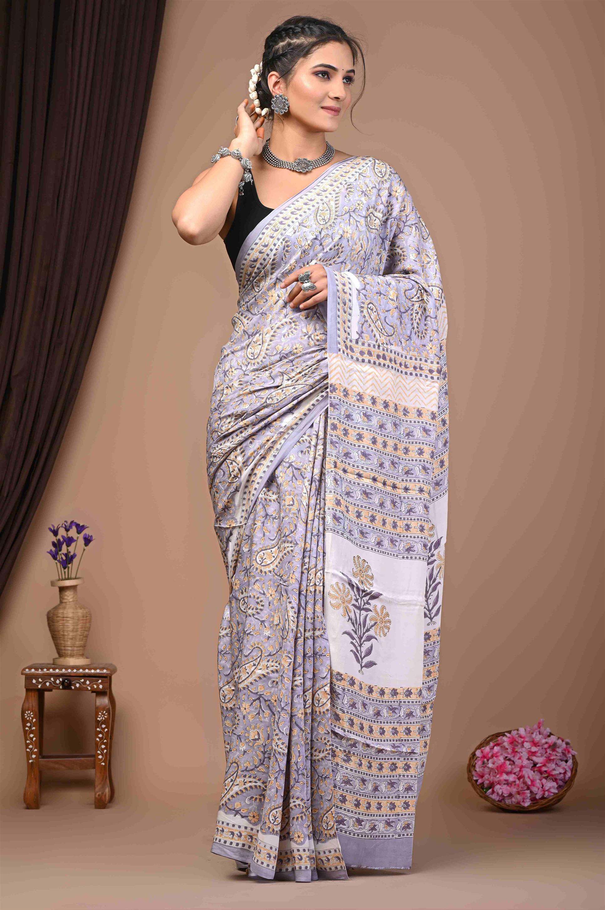 This elegant Modal saree features a rich palette of white with levender adorned with intricate leaf and botanical prints across the body. The pallu showcases complementary patterns, possibly featuring subtle geometric or abstract designs. Modal fabric is known for its luxurious softness, smooth drape, and breathable quality, making this saree incredibly comfortable for all-day wear. A delicate golden border frames the saree, adding a touch of understated sophistication. It offers a refined yet comfortable look, ideal for various occasions, and would be a stylish addition for those in Jaipur, Rajasthan.