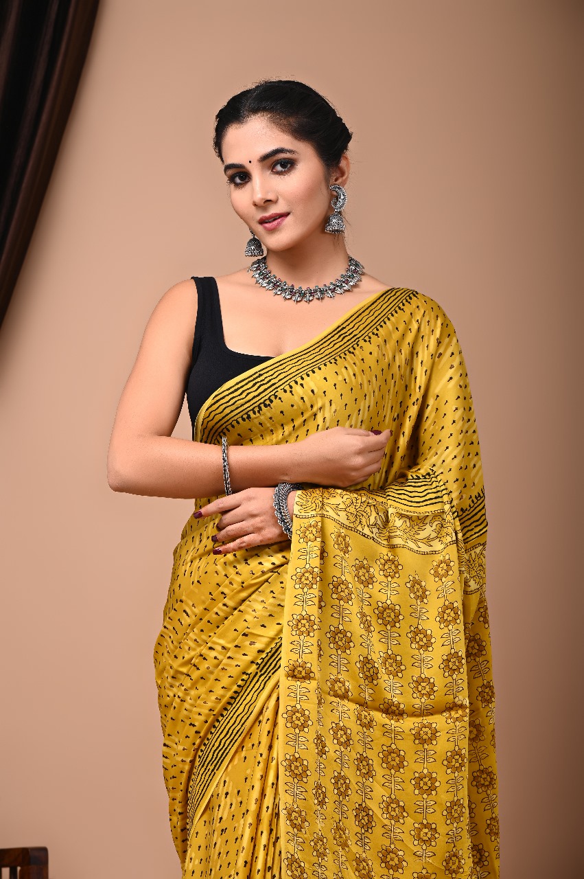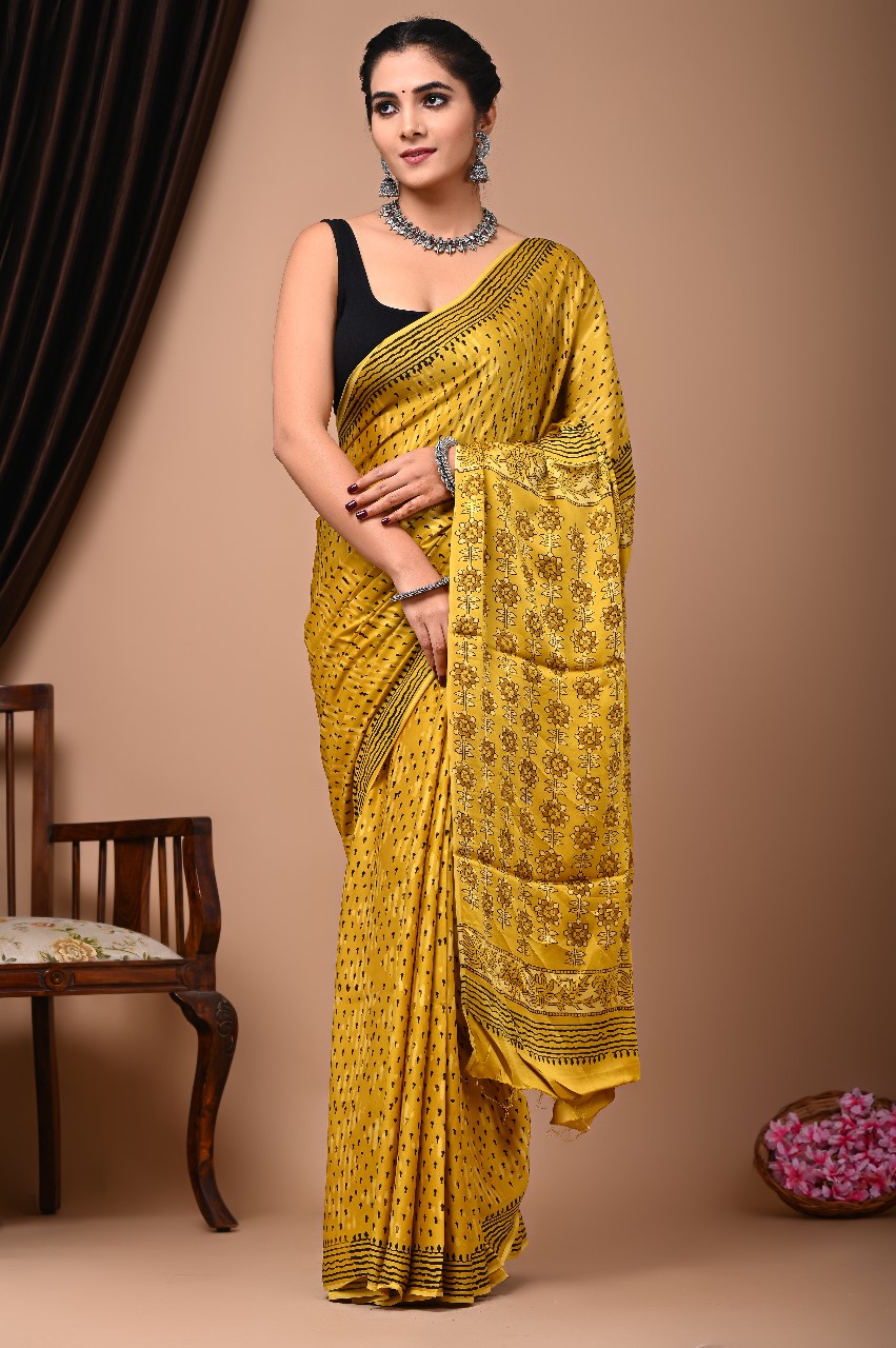 This vibrant Modal saree features a striking mustard yellow base adorned with intricate black printed designs. The body of the saree showcases delicate small motifs, while the pallu is elaborately detailed with traditional patterns, including floral and striped designs in black and hints of beige. A subtle golden border frames the saree, adding a touch of classic elegance. Modal fabric is known for its luxurious softness, smooth drape, and breathable quality, making this saree incredibly comfortable for all-day wear. It offers a cheerful yet sophisticated look, ideal for various occasions, and would be a stylish addition for those in Jaipur, Rajasthan.