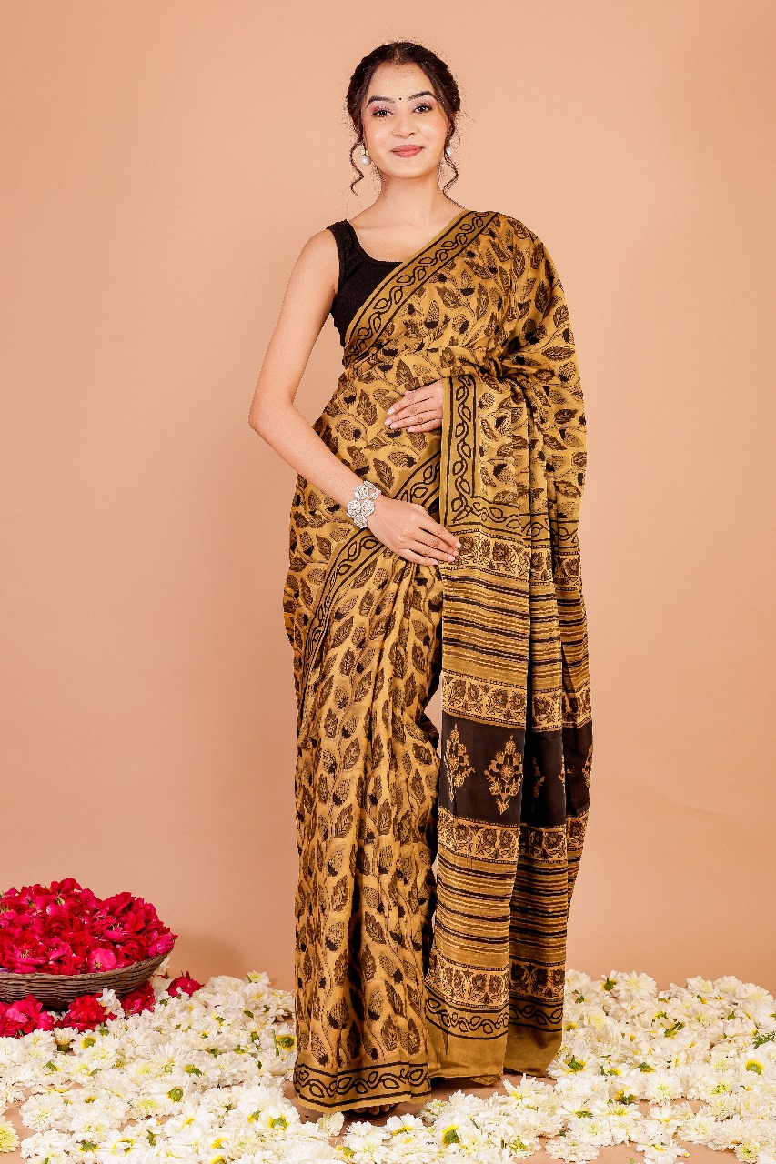 This saree features a rich mustard yellow base adorned with bold black leaf motifsCrafted from a soft silk blend, it drapes gracefully while offering comfort.The pallu showcases intricate stripes and floral patterns in black, adding a striking contrast.A patterned black border frames the saree beautifully, enhancing its elegance.Lightweight and easy to carry, it’s perfect for festive events or casual gatherings.A timeless ethnic piece with a warm, earthy charm.