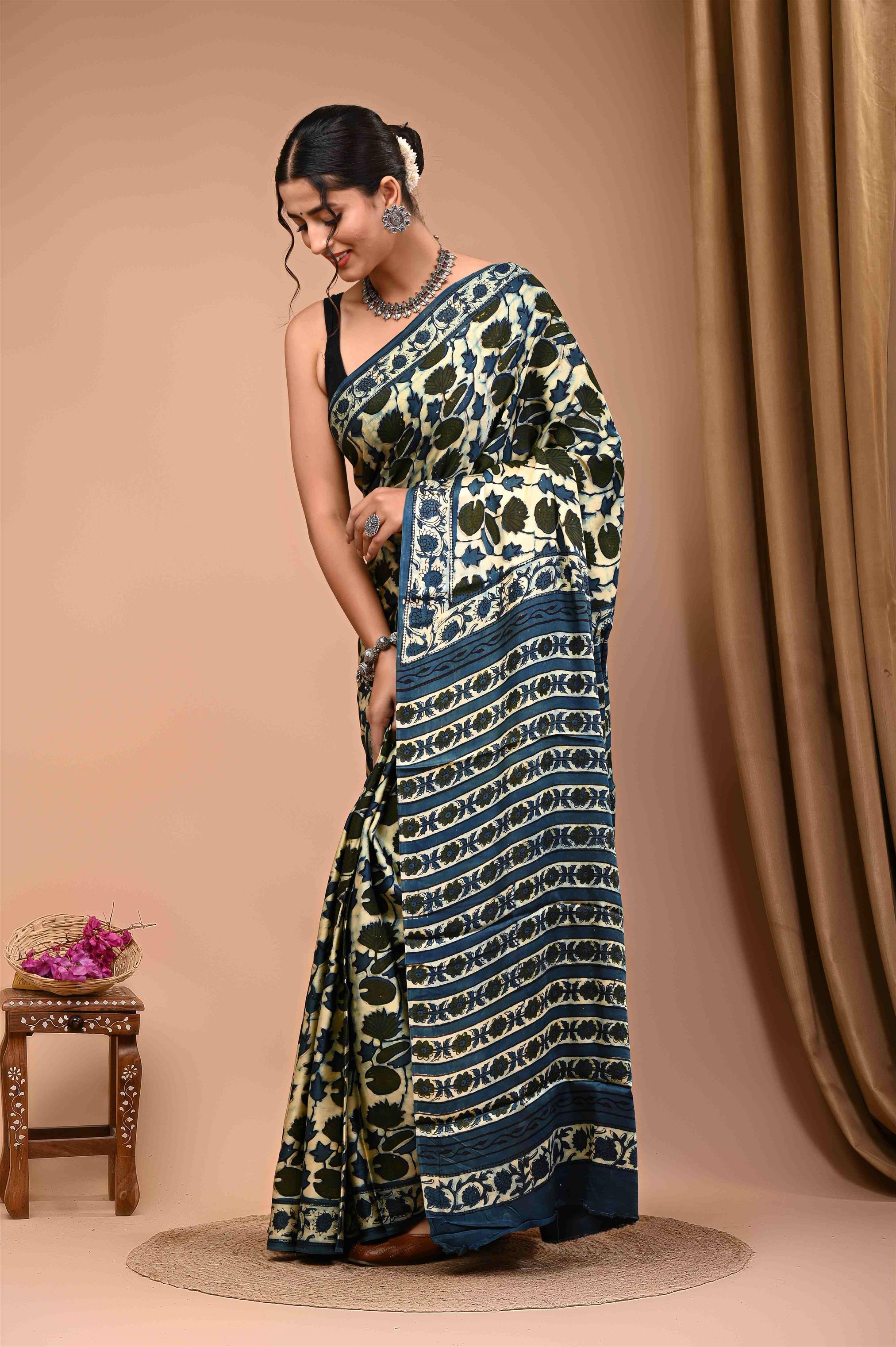 WOMENS CREAM AND GREEN MODAL SILK SAREE