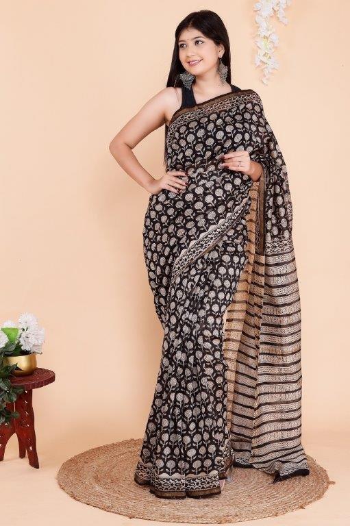 Elevate your ethnic style with this beautiful black handblock printed cotton saree. Featuring traditional floral motifs across the body and a contrasting striped pallu, this saree brings together elegance and craftsmanship. Made from breathable cotton fabric, it's ideal for daily wear, office attire, or casual gatherings. The earthy black and beige tones add timeless charm, while the unstitched blouse piece lets you customize your look effortlessly.