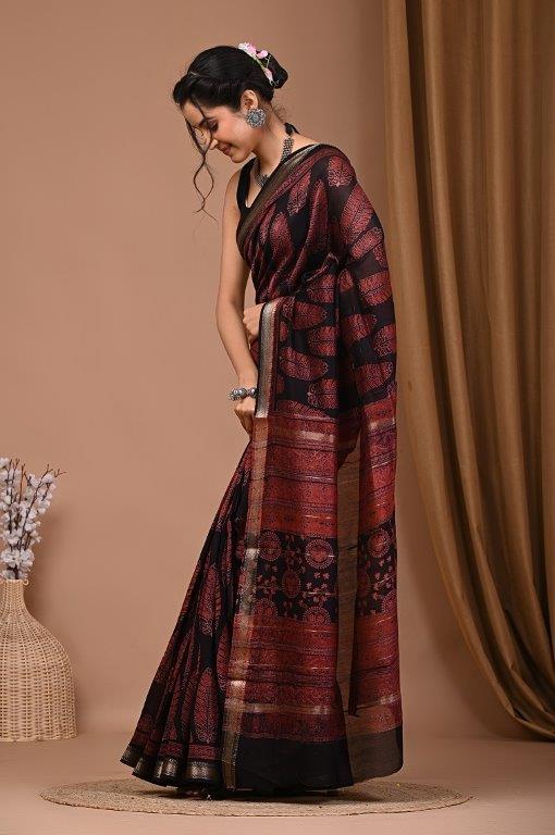Women''s Black & Red Printed Maheshwari Ajrakh Saree