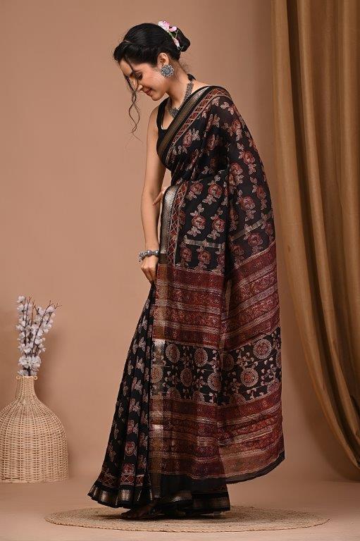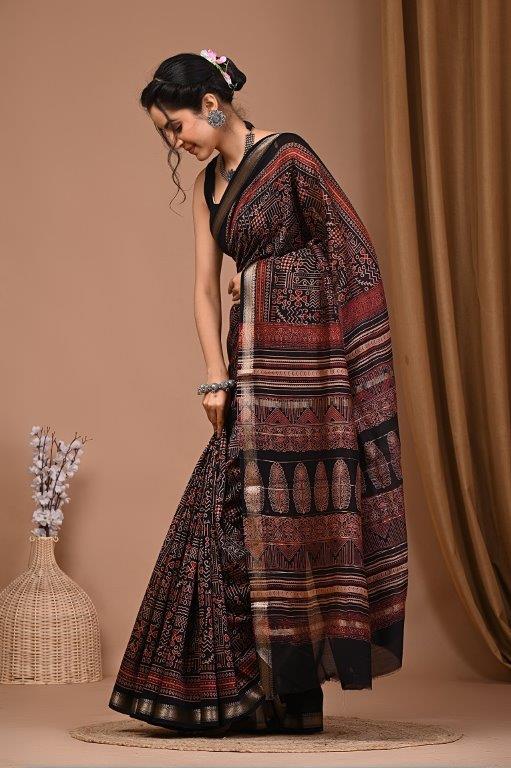 This striking Maheshwari Ajrakh saree features a deep black base adorned with intricate traditional prints in shades of red and orange, characteristic of Ajrakh artistry. The body of the saree has a detailed repeating pattern, while the pallu is an exquisite display of diverse motifs, including geometric designs, stripes, and stylized elements, all in vibrant red and orange tones. The saree is elegantly framed with subtle golden and silver borders that add a touch of sophisticated shimmer. Maheshwari sarees are known for their lightweight and airy texture, making this saree a comfortable and elegant choice, perfectly suited for the warm climate of Jaipur, Rajasthan. This saree is ideal for festive occasions, cultural gatherings, or sophisticated daily wear, embodying a beautiful blend of traditional craftsmanship and contemporary style.