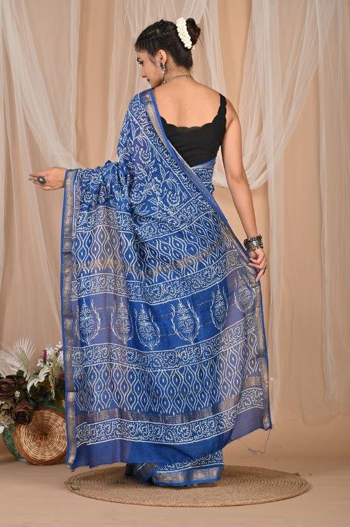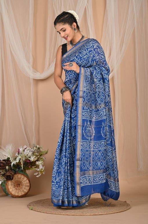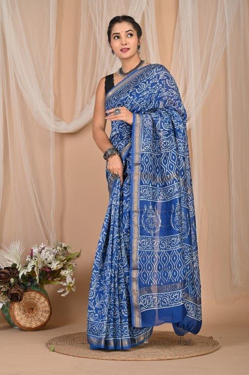 This exquisite Maheshwari saree, renowned for its lightweight and airy feel, features a vibrant royal blue base adorned with intricate white or off-white prints. The patterns are a mix of traditional motifs, possibly botanical or abstract designs, distributed throughout the body and pallu. Maheshwari sarees are known for their fine silk and cotton blend, making them comfortable and elegant. The saree is bordered with subtle golden lines, adding a touch of sophisticated shimmer. This beautiful saree is an ideal choice for festive occasions, cultural gatherings, or sophisticated daily wear, offering a graceful blend of traditional artistry and contemporary elegance, originating from the rich textile heritage of Maheshwar, Madhya Pradesh.