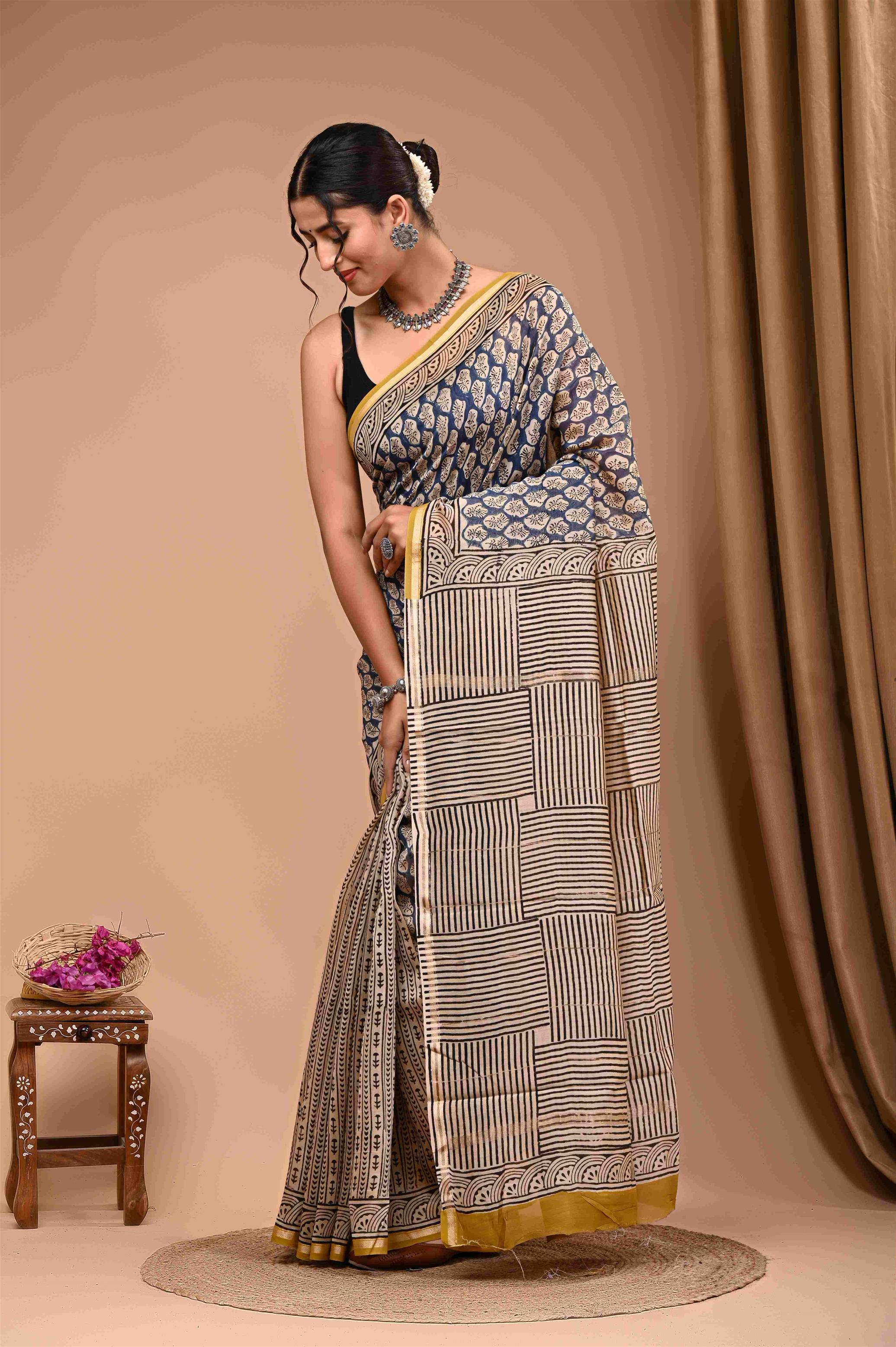 The sari is a blue and white patterned garment with gold accents along the edges. It is draped elegantly around the woman's body, with the pallu (the decorative end of the sari) hanging down from her left shoulder. The sari appears to be made of a lightweight material, possibly silk or cotton, and features a intricate design that adds to its beauty. The gold accents along the edges add a touch of luxury and sophistication to the overall look.