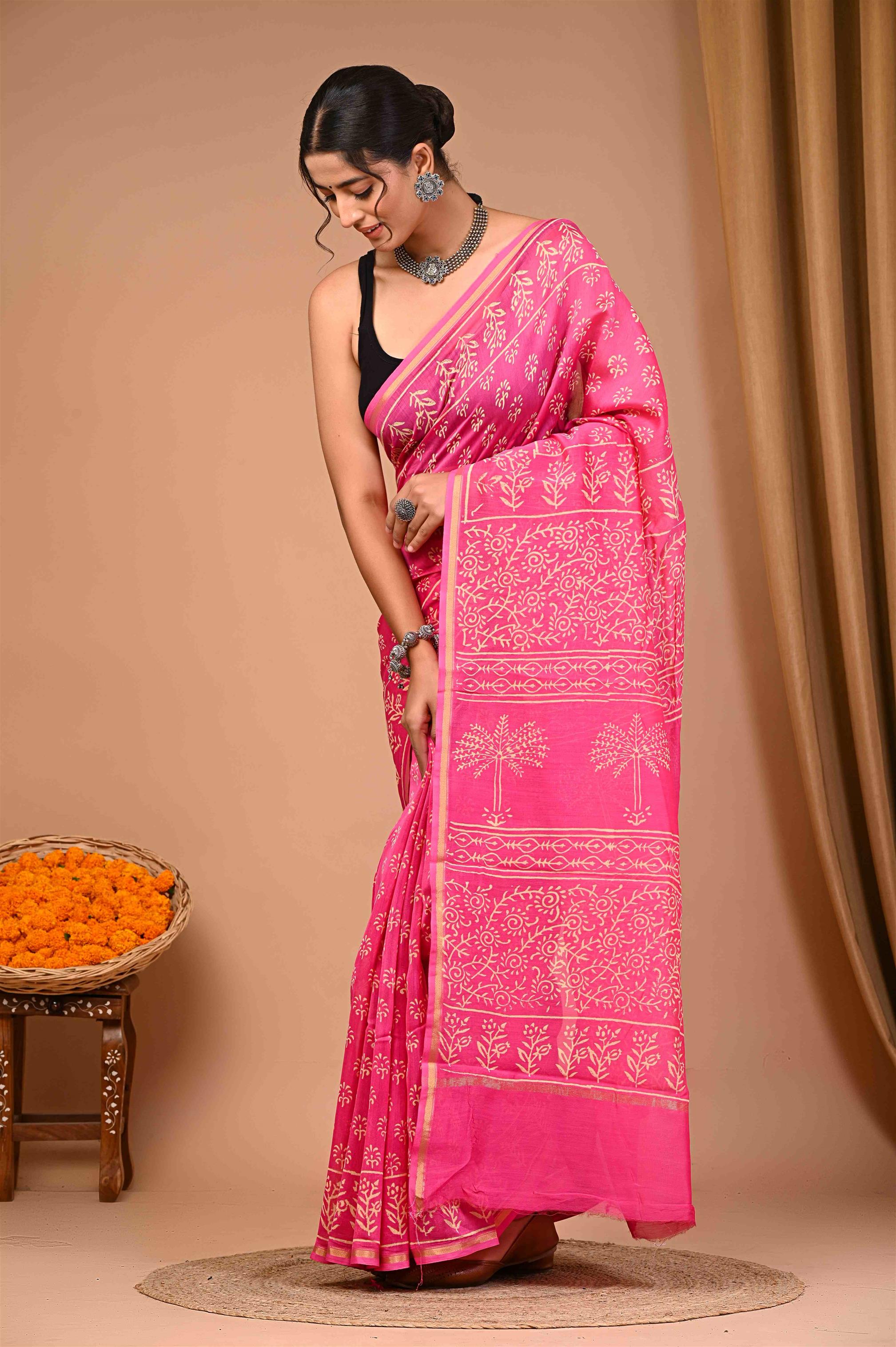 The saree is a vibrant pink color with intricate white designs and patterns. It features a variety of motifs, including floral elements and other decorative elements, which are subtly woven into the fabric. The saree's design is elegant and sophisticated, making it a beautiful piece of traditional Indian attire.