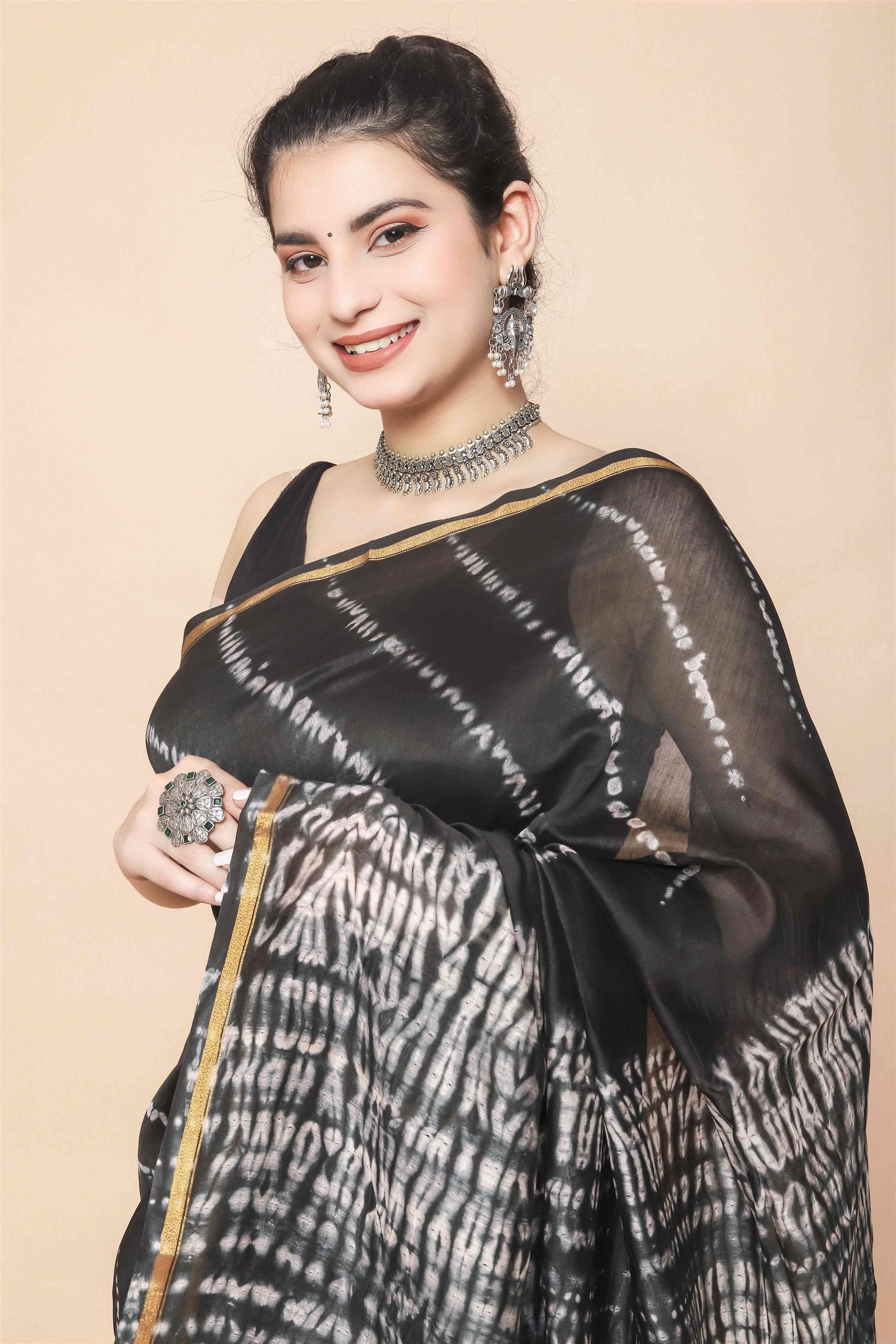 The saree is a black and white patterned saree with a striking design. It features white tie-dye or bandhani patterns on a black base, giving it a unique texture and visual appeal. The saree has a gold border or trim along its edges, adding a touch of elegance. It's draped elegantly on the woman, showcasing its flow and style. The overall look is sophisticated and traditional, blending classic draping with a modern design twist. The woman's accessories like the silver necklace and earrings complement the saree nicely. ??