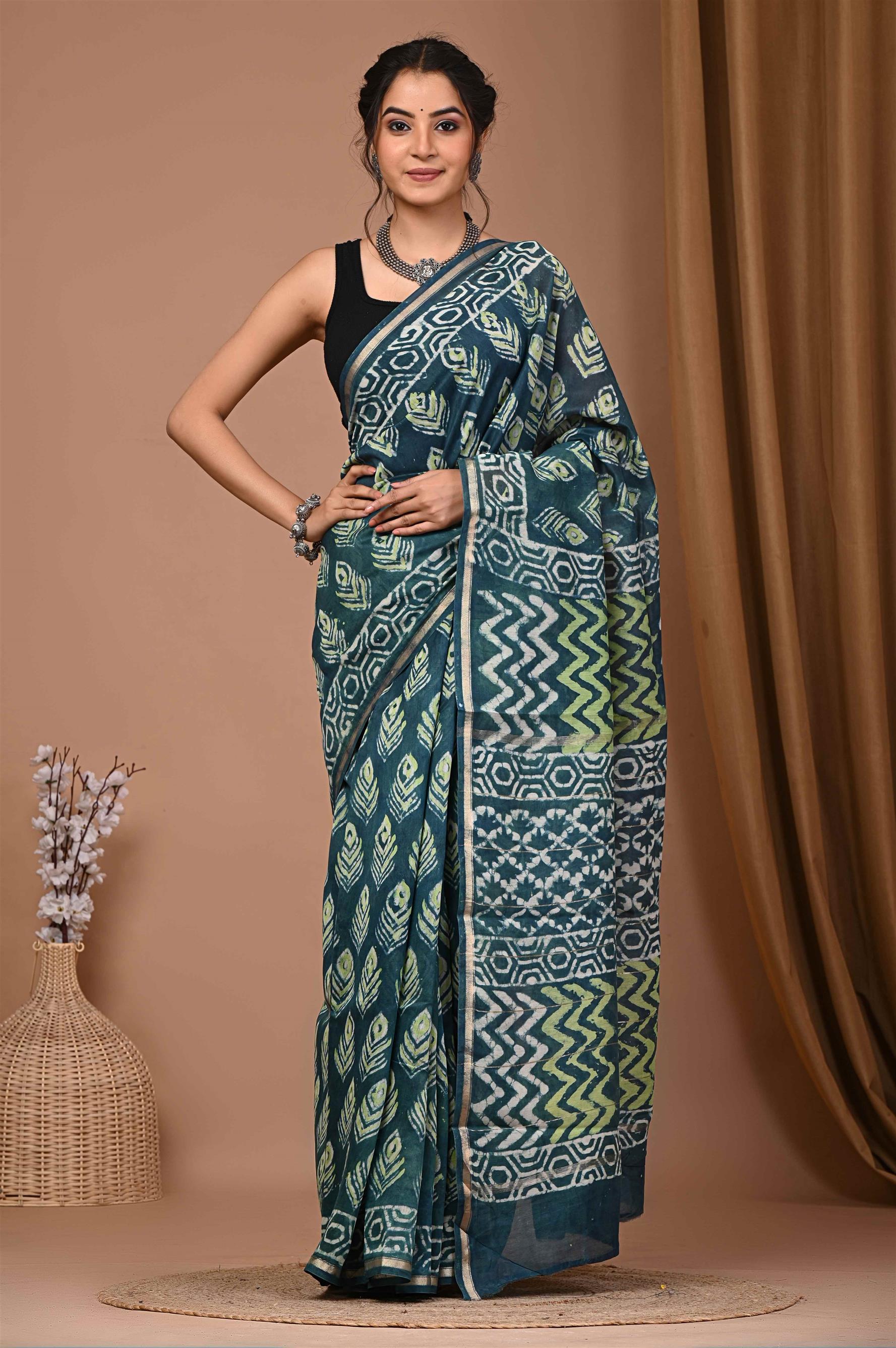 The saree in the image is dark green with various patterns in light green and white. It has a mix of geometric designs like zigzags, hexagons, and leaf-like patterns. There's a border at the bottom of the saree. ??