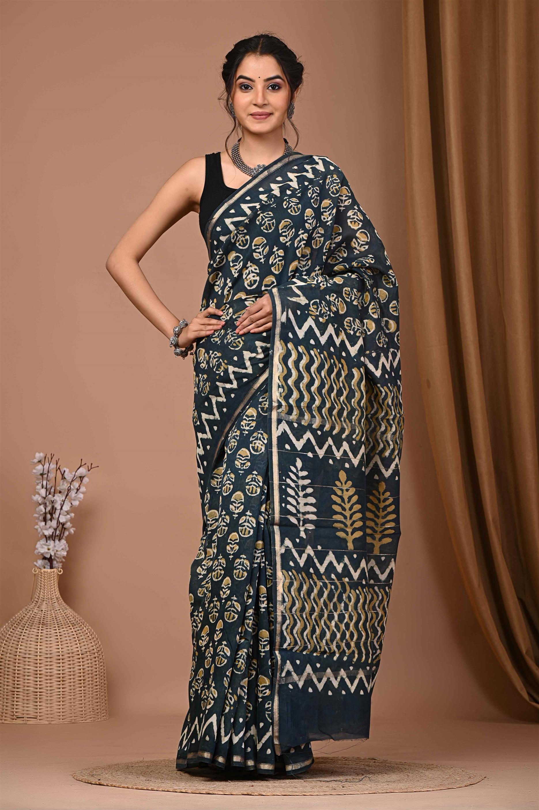 The saree in the image is dark green with gold and white patterns. It has a mix of zigzag lines, leaf motifs, and other geometric patterns in gold and white on a dark green base. The saree also has a gold border at the bottom. ??