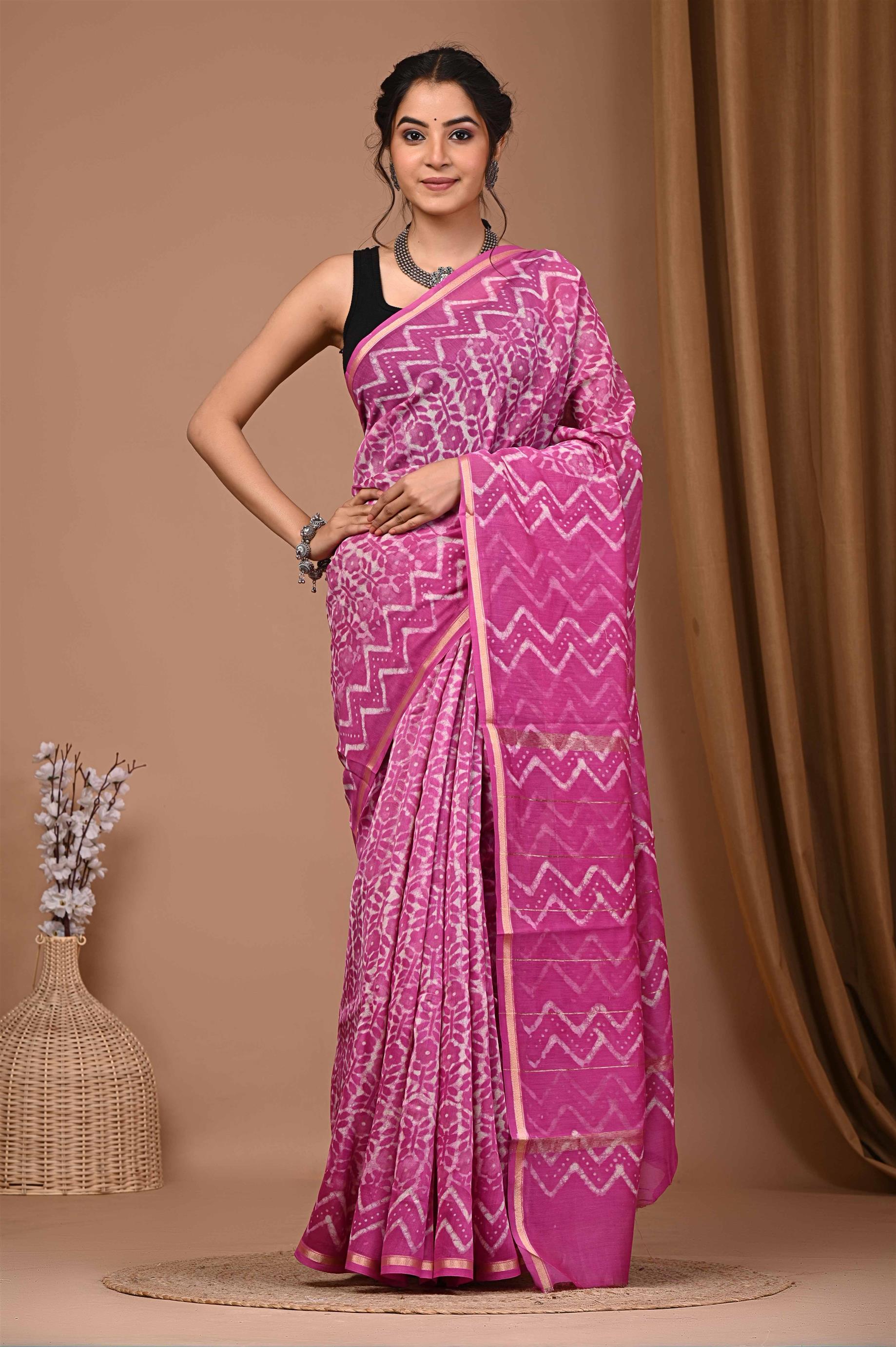 The saree is pink with white zig-zag and other patterns. It has a gold border at the bottom and along the edges. The saree is draped elegantly on the woman, paired with a black sleeveless blouse. Silver jewelry like a necklace and bracelet complement the outfit.