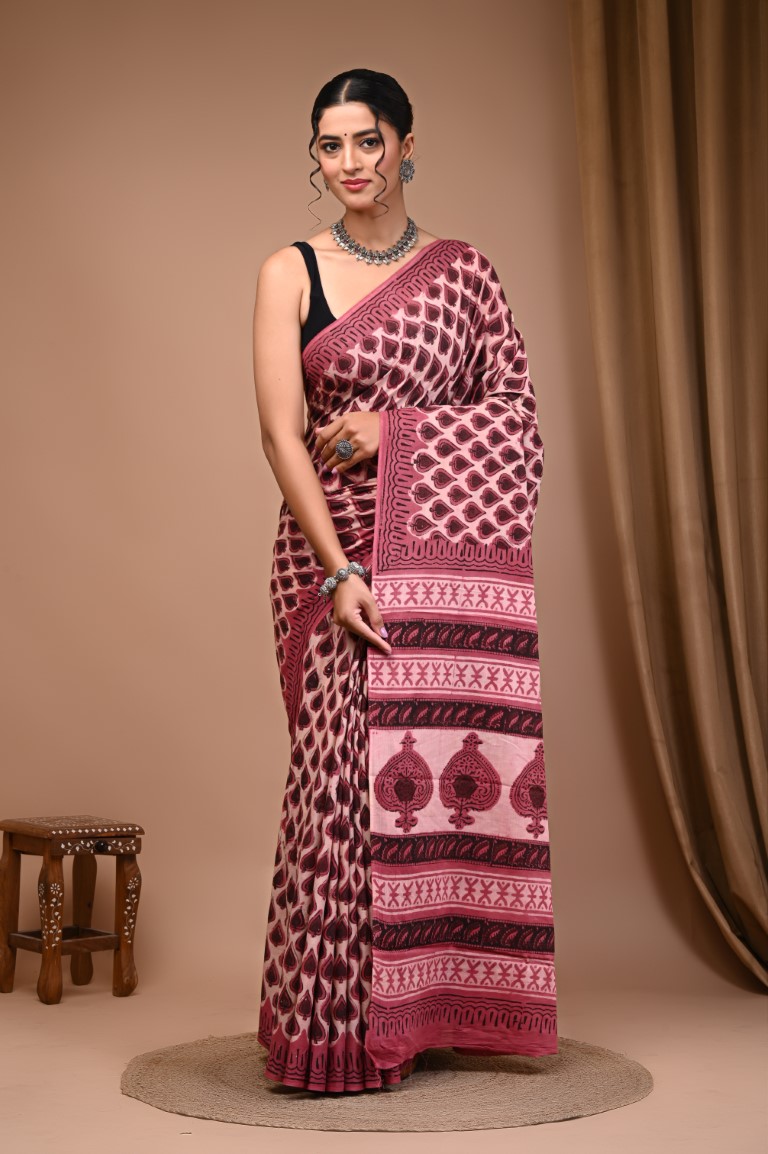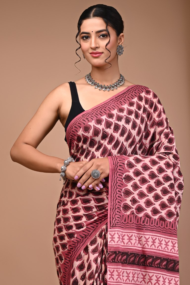 Vanaspati Ajrakh hand block printed cotton Mulmul sarees Size Saree = 5.5 mtr Blouse = 0.80 mtr
