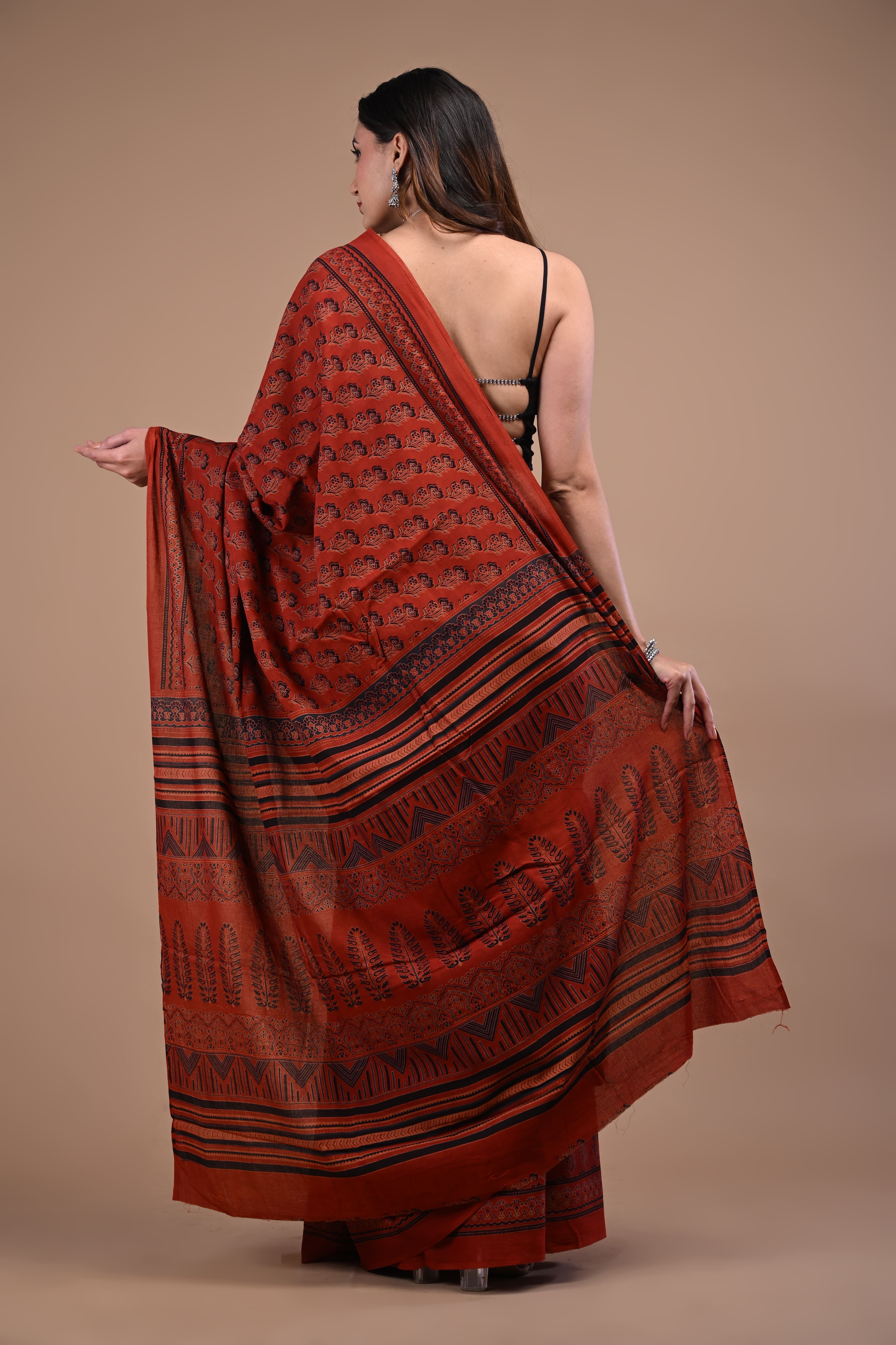 Vanaspati Ajrakh hand block printed cotton Mulmul sarees Size Saree = 5.5 mtr Blouse = 0.80 mtr