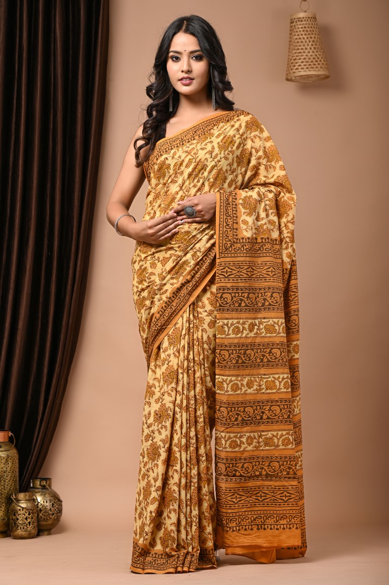 The saree is in shades of yellow and orange with brown patterns. It has a beautiful floral and geometric design printed on it. The saree is draped elegantly on the woman, showcasing its intricate patterns and colours.
