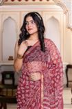 The saree is red with intricate white patterns. It has a gold border at the bottom and seems to be made of a sheer fabric, possibly chiffon or georgette, given its flowy appearance. The white patterns on the red saree add a traditional touch, likely indicating a bandhani or similar print, which is popular in Indian textiles.