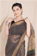 The saree in the image is primarily in shades of brown, gold, green, and black. It has a striped pattern with a mix of these colours and features a patchwork design on one end of the saree draped over the woman's shoulder. The saree also has a gold border at the bottom. ??