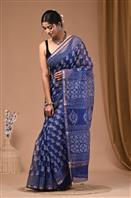 The saree in the image is blue with white patterns. It has a gold border at the bottom and seems to be made of a lightweight fabric, possibly chiffon or georgette, given its flowy look. The white patterns on the blue saree give it a traditional and elegant vibe ??.