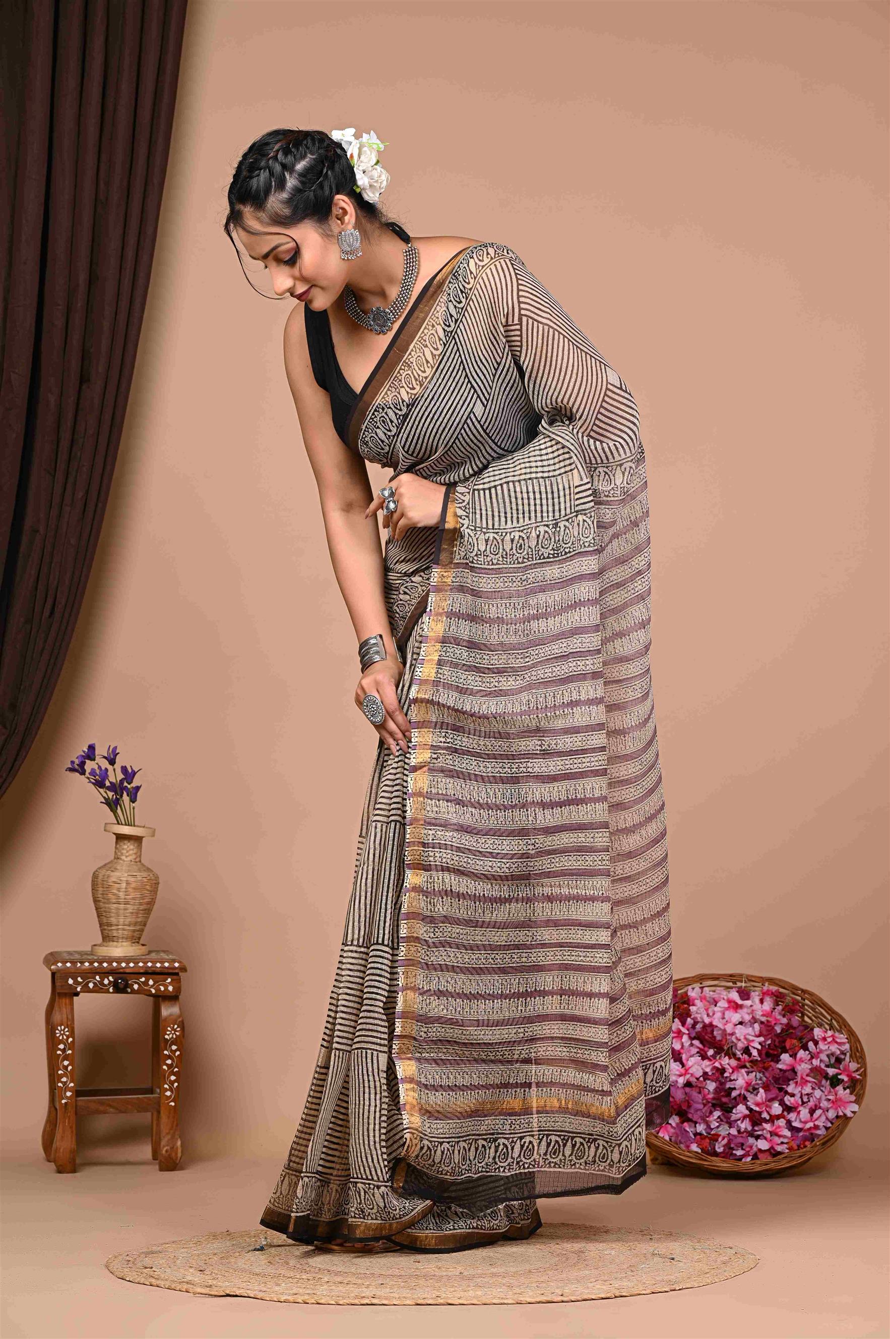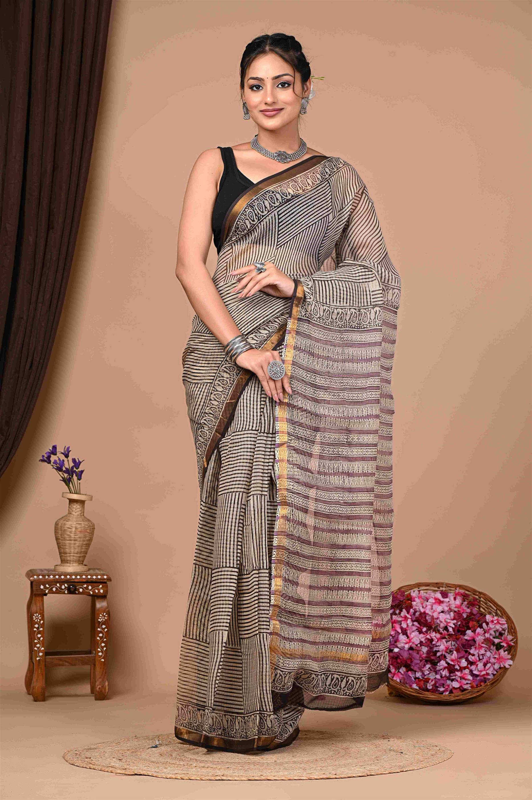 The saree in the image is primarily in shades of brown, black, and gold. It has a striped pattern with intricate designs and a gold border. The saree is draped elegantly on the woman, showcasing its unique texture and pattern. ??