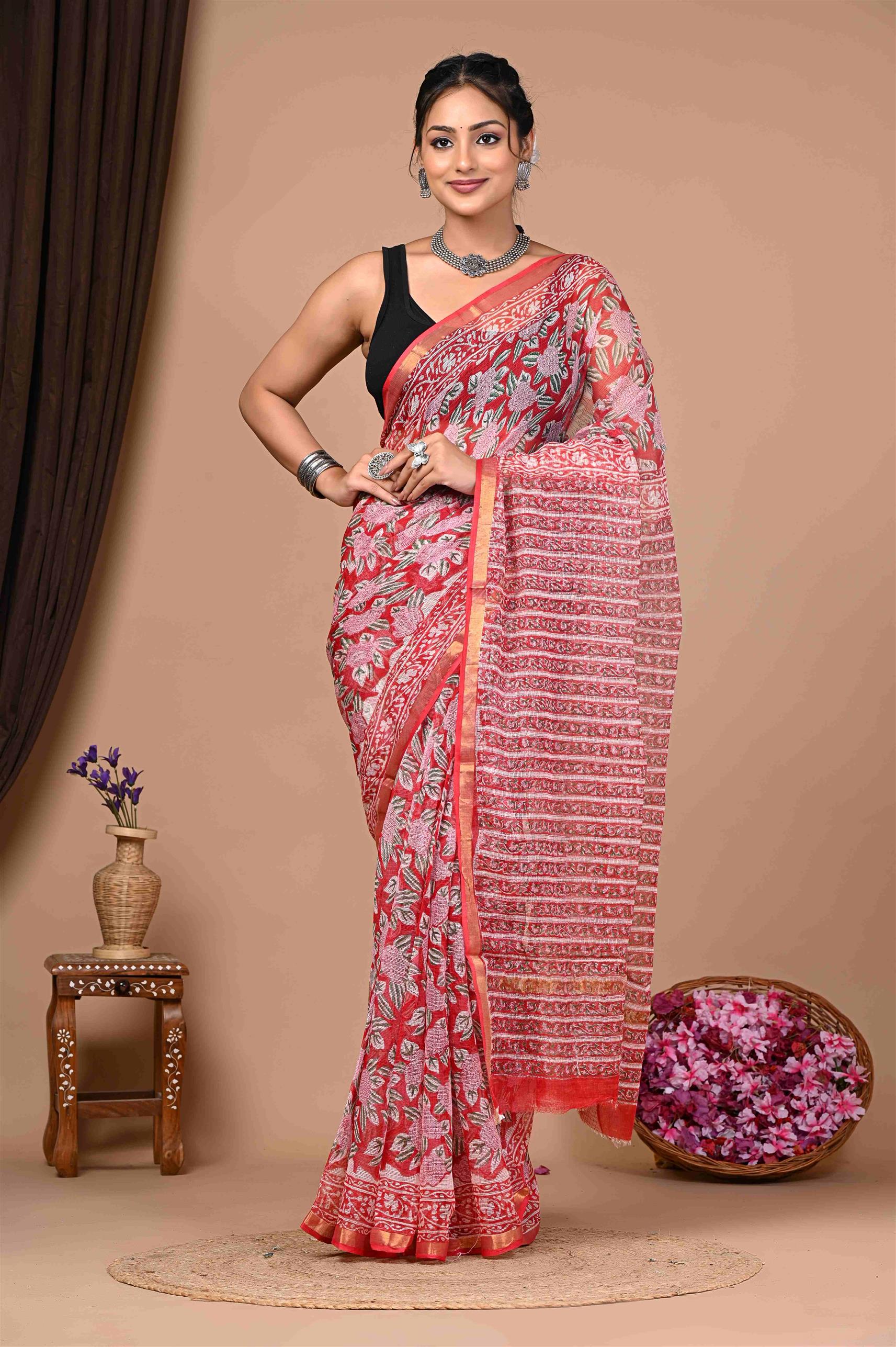 The saree is red with intricate silver and white floral patterns. It has a gold border at the bottom and a thin orange border along the edges. ??