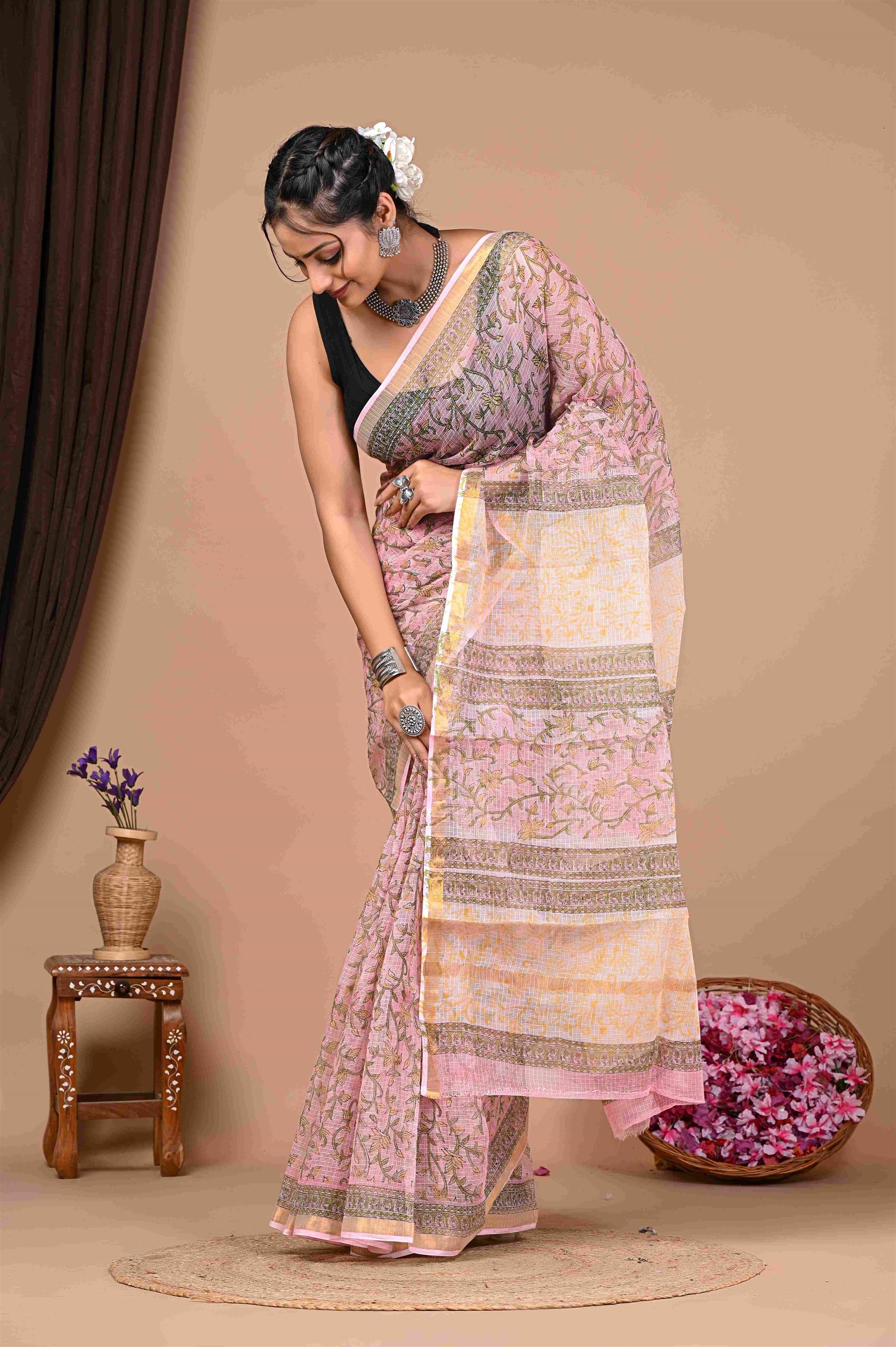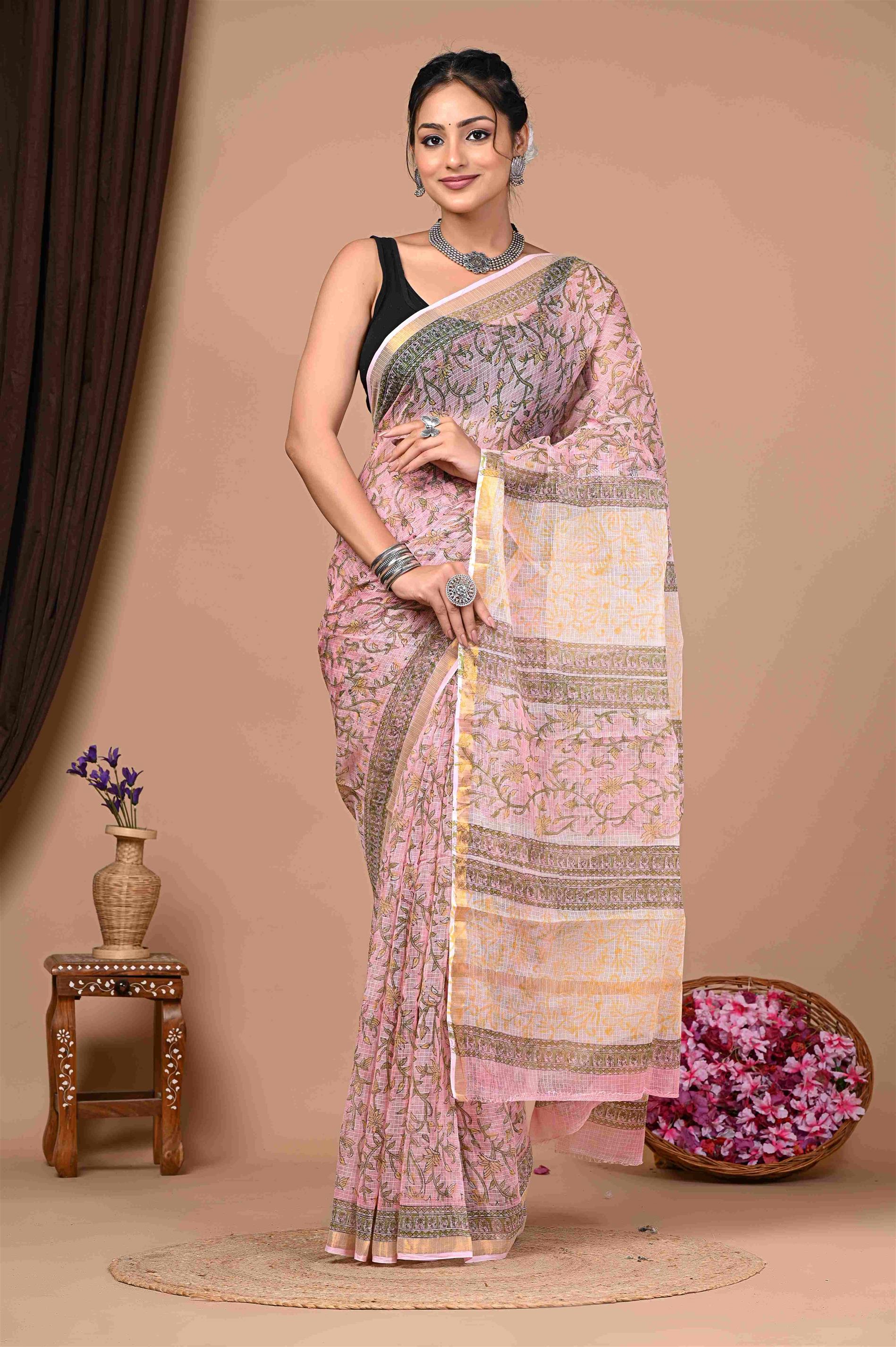 The saree in the image is pink with intricate patterns and designs. It has a mix of pink, gold, and green hues with floral or paisley-like patterns. The saree also features gold borders and accents, adding to its elegance. ??