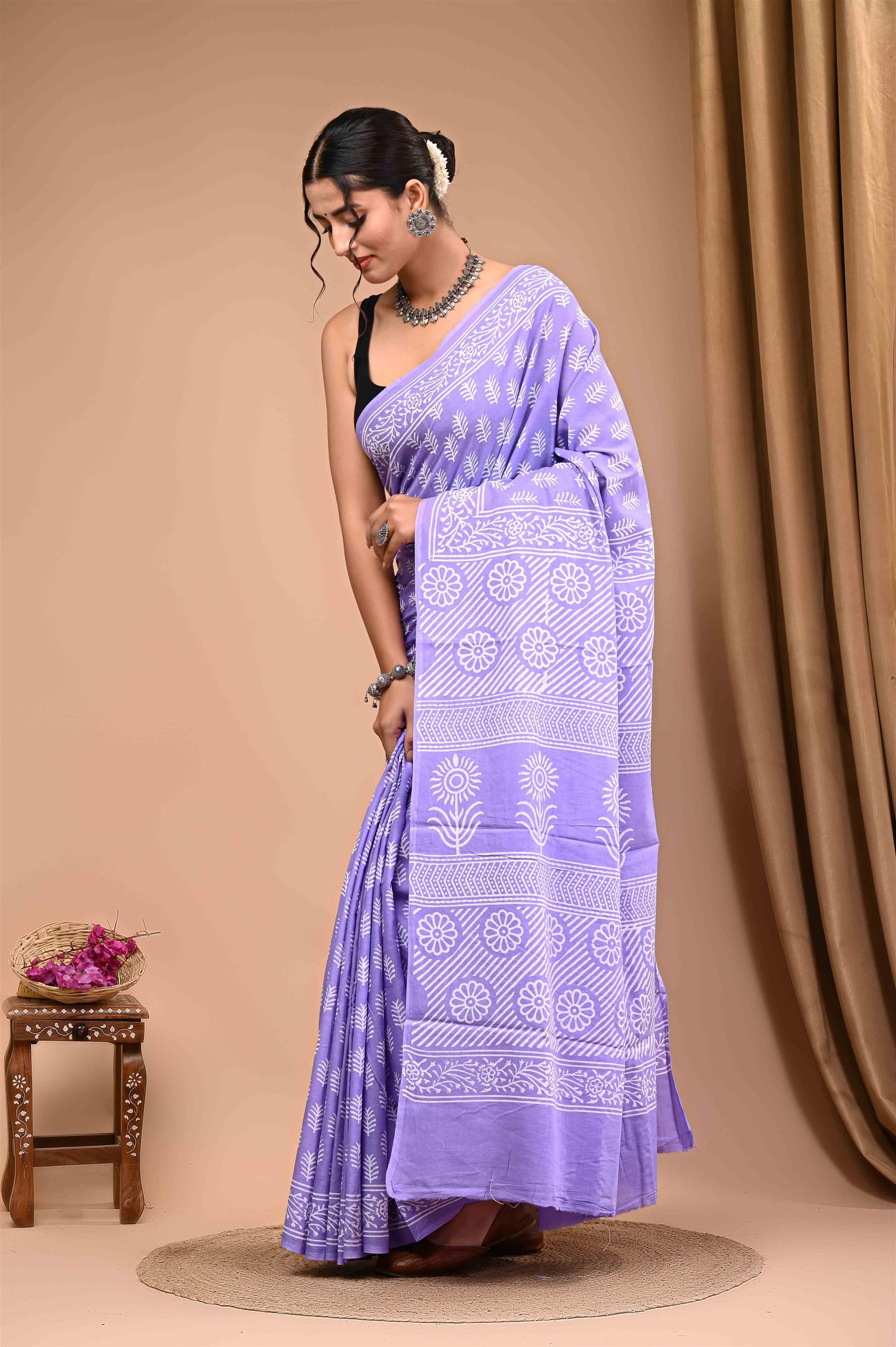 The saree is a beautiful, soft lavender color with intricate white designs and patterns. The fabric appears to be lightweight and flowing, draping elegantly around the woman's body. The saree features a classic Nivi drape style, with the pallu (the decorative end of the saree) draped over the woman's left shoulder. The white designs on the saree include floral motifs, geometric patterns, and other traditional Indian designs, adding a touch of elegance and sophistication to the overall look. The saree is paired with a matching lavender blouse and accessorized with silver jewelry, including a necklace, earrings, and bangles, which complement the saree perfectly.
