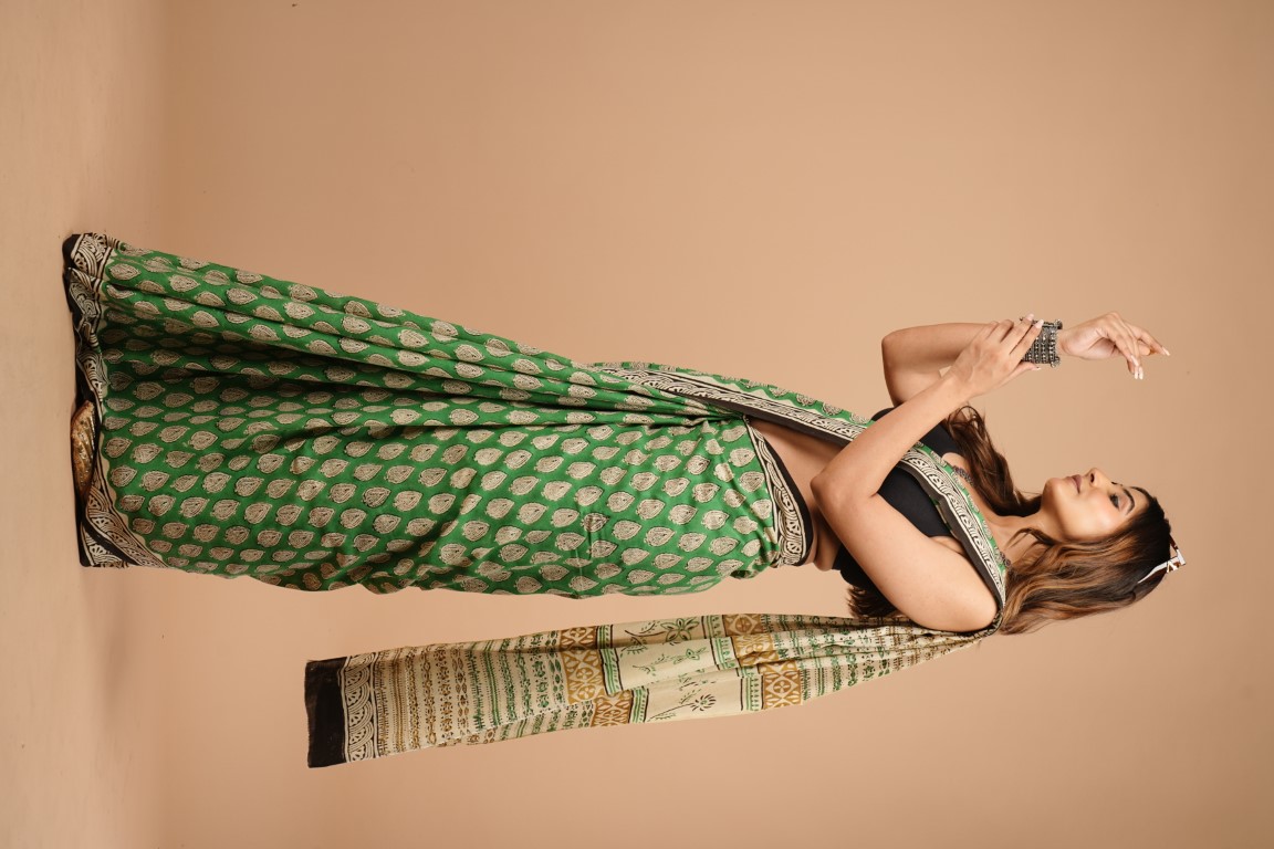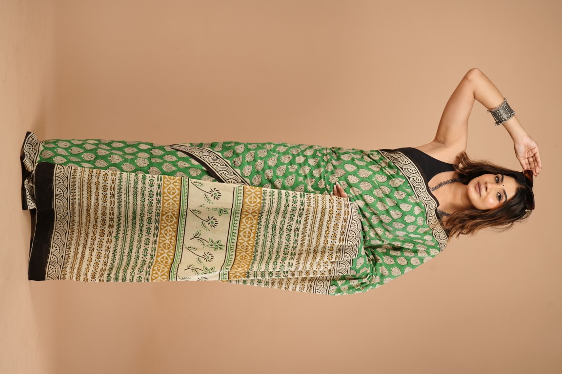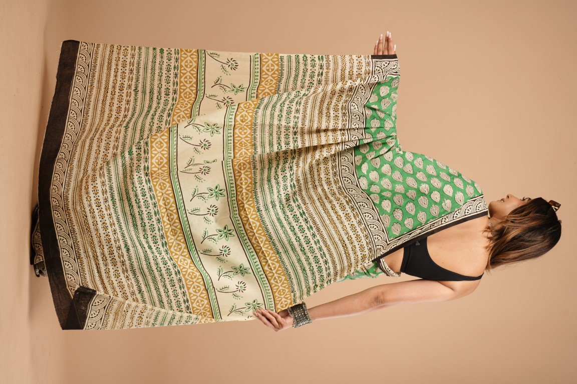 The saree is green with gold patterns. It has a border with intricate designs in gold and black.