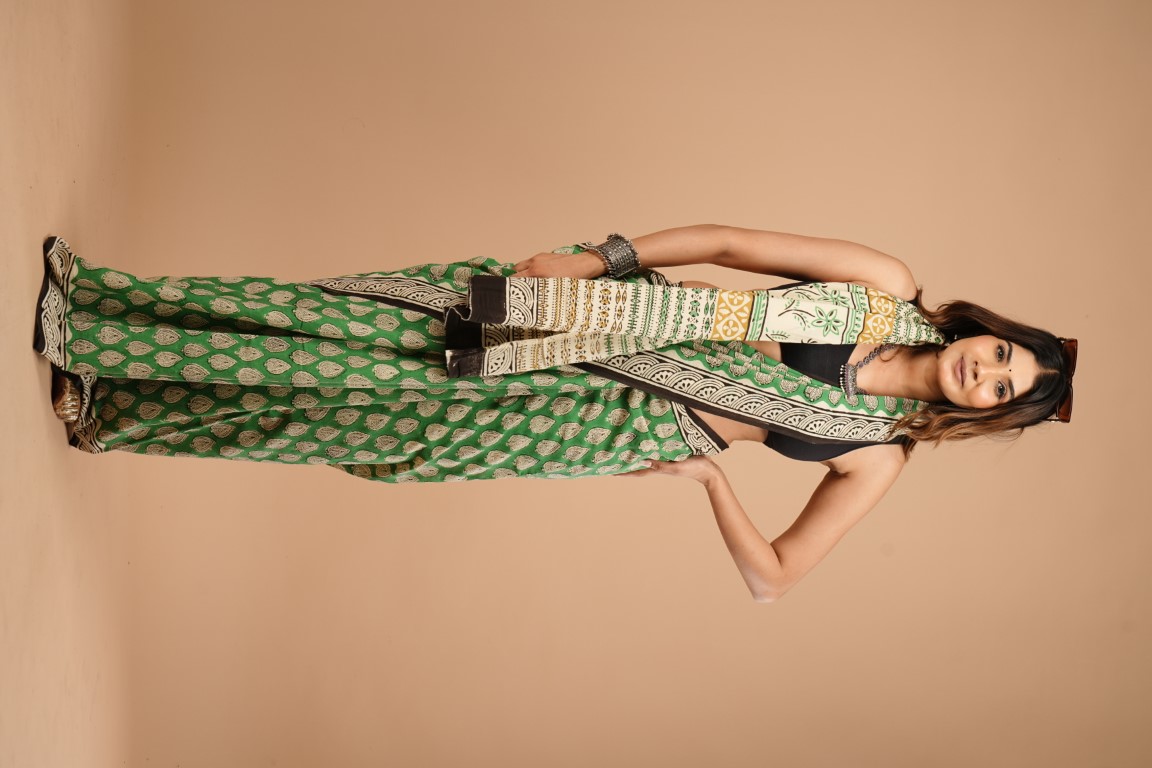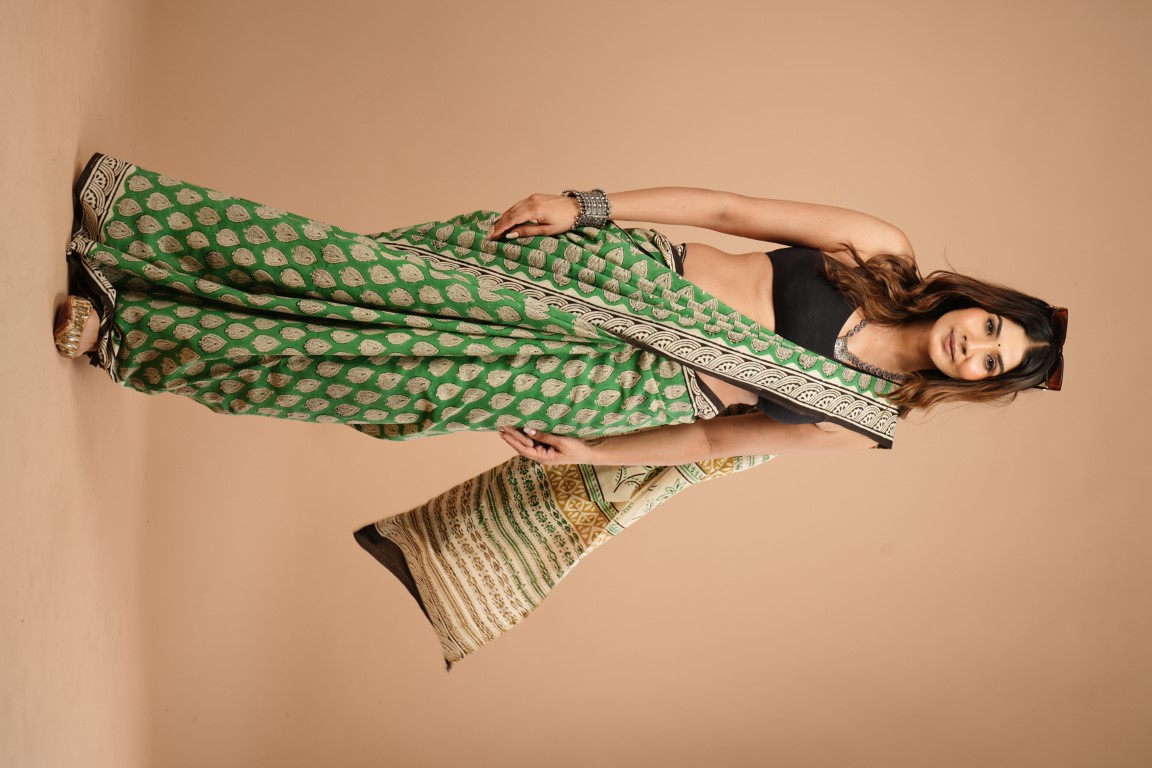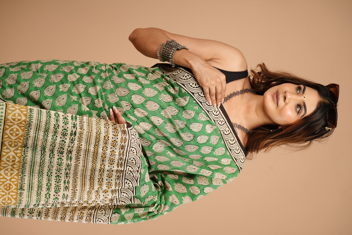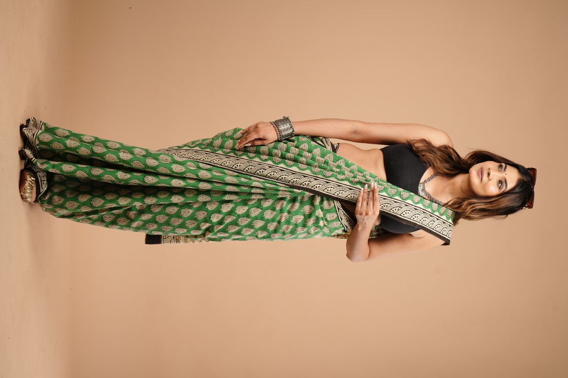 The saree is green with gold patterns. It has a border with intricate designs in gold and black.