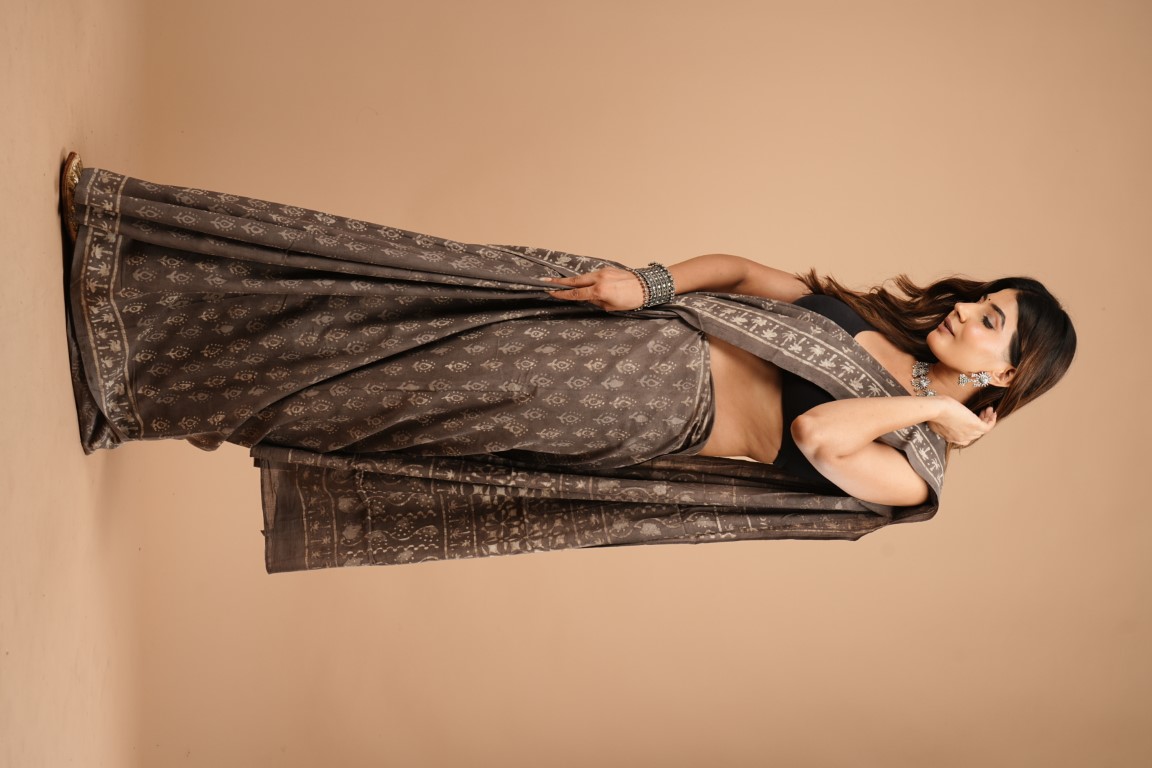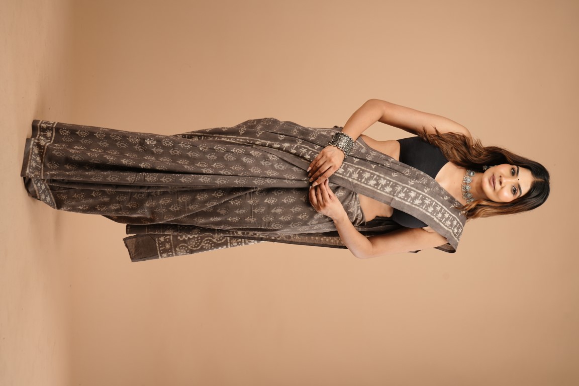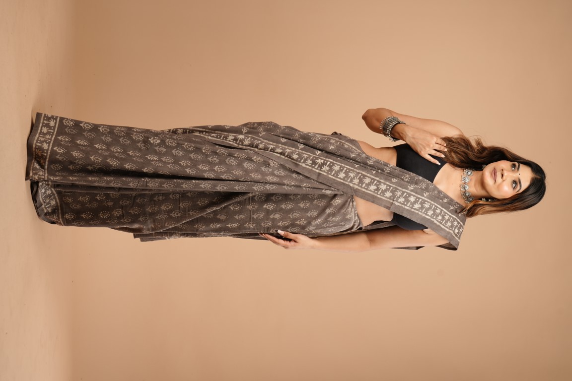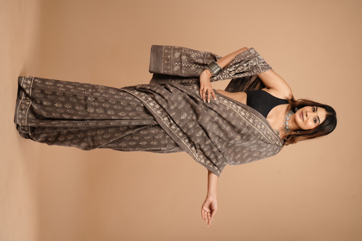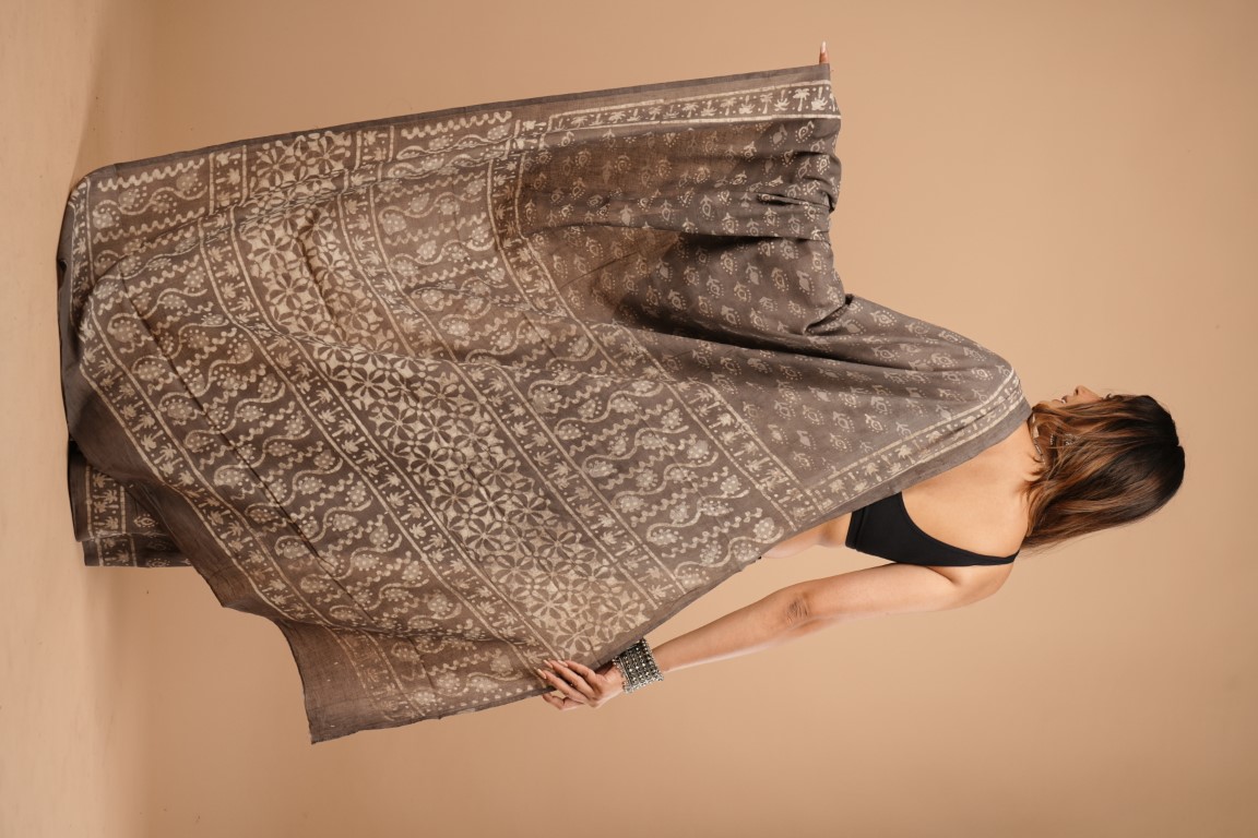 The saree is brown with a pattern of light brown designs. It has a border with intricate patterns along the edges. The woman is wearing it with a black blouse and some jewellery like a necklace, bangles, and earrings.