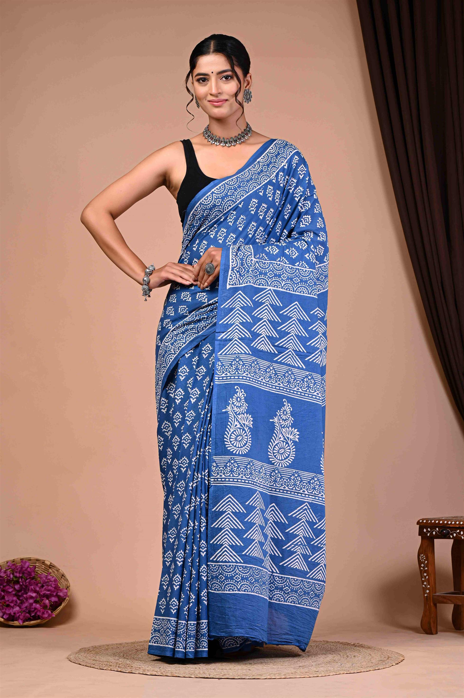 The saree is a beautiful blue color with intricate white patterns and designs. The fabric appears to be lightweight and flowing, draping elegantly around the woman's body. The saree features a unique blend of motifs, including floral and geometric patterns, which add a touch of cultural heritage to the overall look. The white designs on the saree complement the blue color perfectly, creating a beautiful visual effect. The saree is paired with a black sleeveless blouse, and the overall ensemble is accessorized with silver jewelry, including a necklace, earrings, and a bangle, which add a touch of sophistication to the look.
