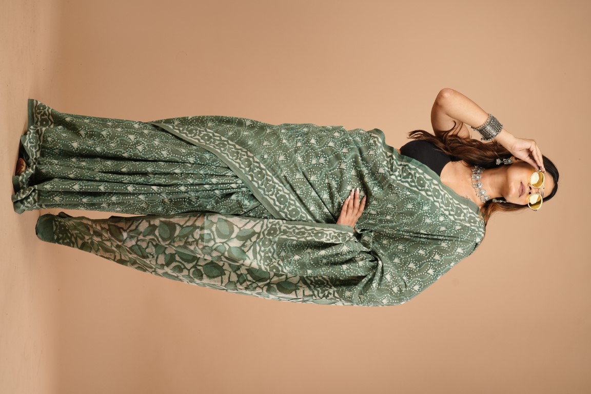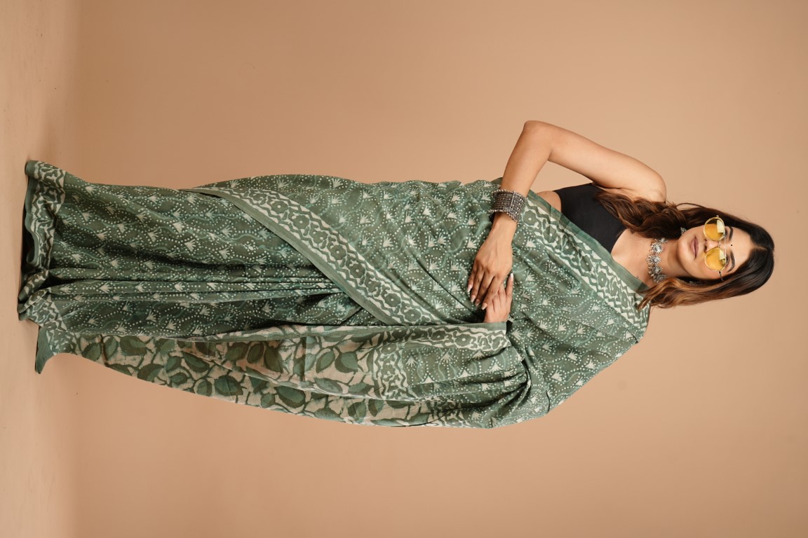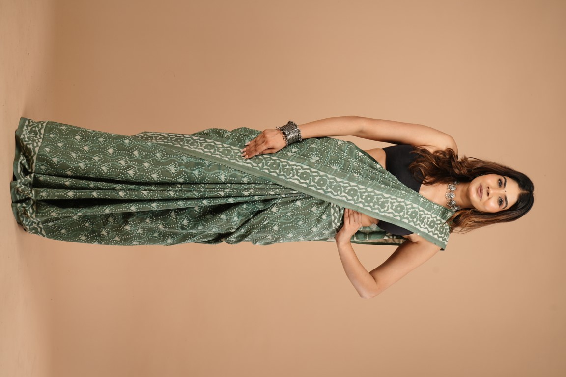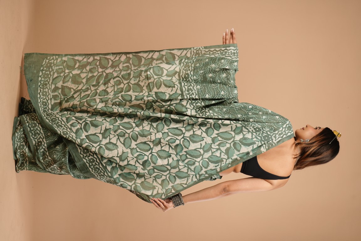 The saree is green with intricate white patterns, featuring various designs like floral motifs and geometric shapes. It's a cotton saree with a beautiful, elegant look.
