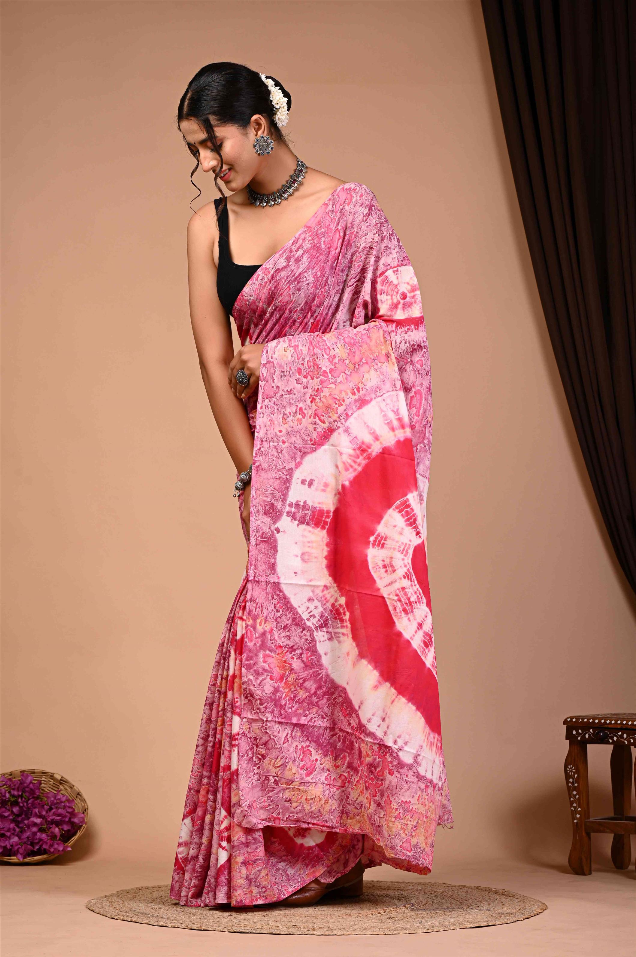 The saree in the image is a vibrant pink and red tie-dye saree with intricate patterns. The saree is draped elegantly around the woman, showcasing its unique design and color palette. The tie-dye effect gives the saree a distinctive and eye-catching appearance, making it a stunning piece of traditional Indian attire. The saree is paired with a black blouse, which provides a striking contrast to the bright colors of the saree. Overall, the saree is a beautiful representation of Indian fashion and culture.