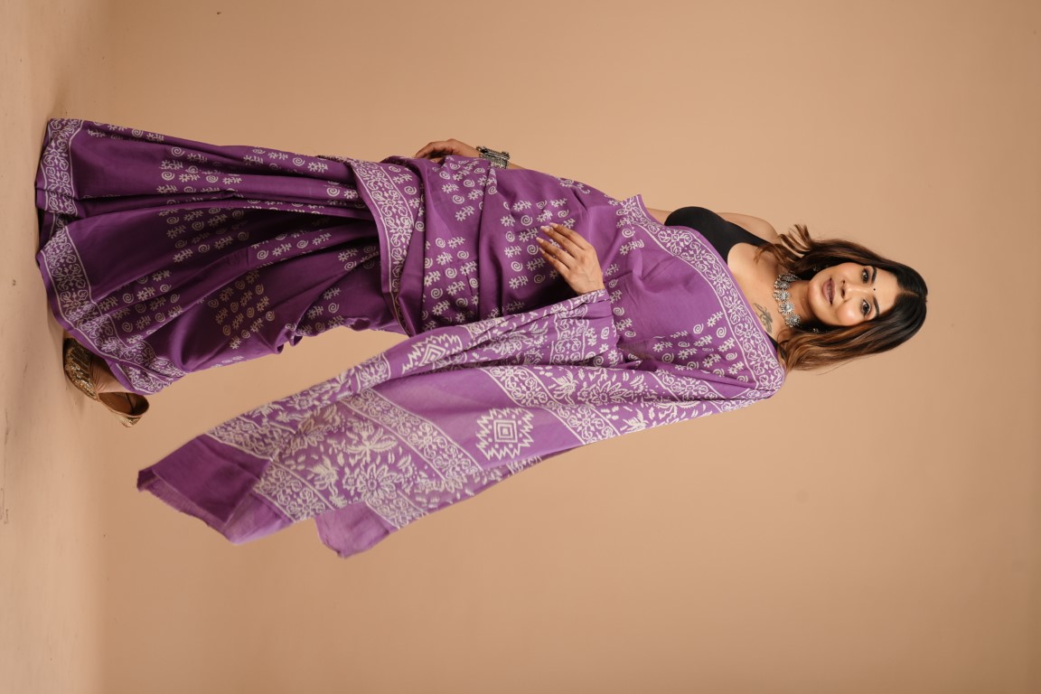 The saree is purple with white patterns. It has intricate white designs and motifs printed on it, adding a touch of elegance. The woman is wearing it with a black blouse and some beautiful jewellery ??.
