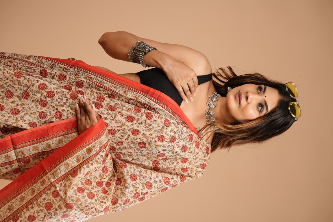 The woman in the image is wearing a traditional Indian sari with a beige base adorned with red floral patterns and a striking red border. She's paired it with a black sleeveless blouse and accessorized with a silver necklace, bangles, and a bindi on her forehead. Her dark brown hair complements the outfit. She's standing against a plain beige background, showcasing the sari's intricate design ??.