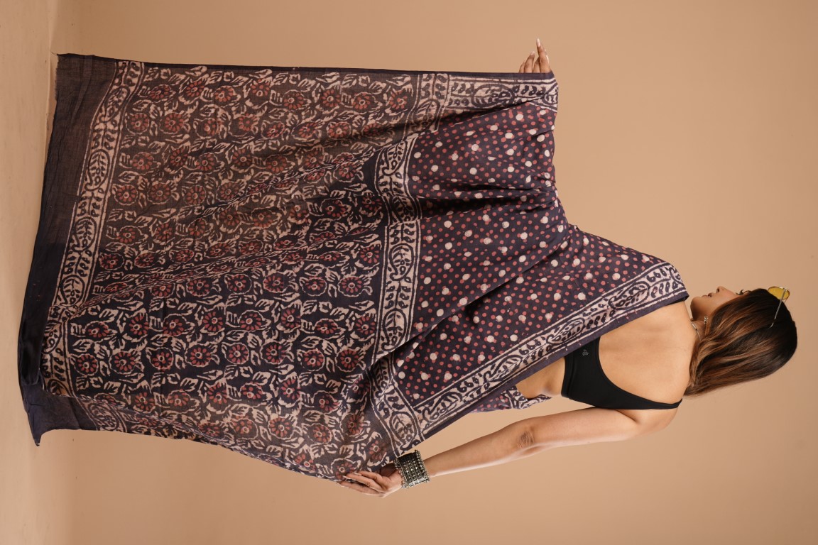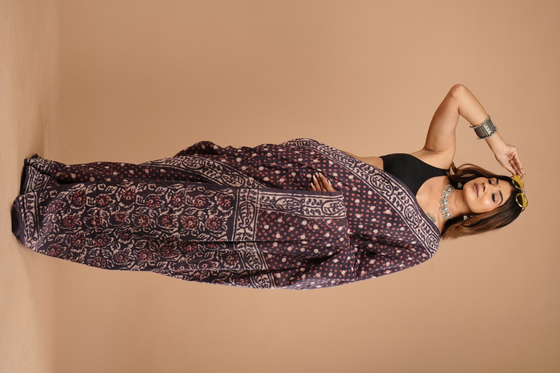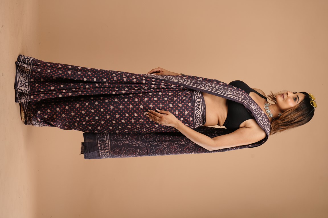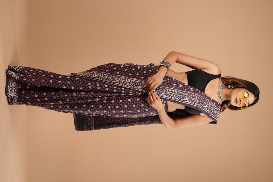 The saree is dark purple with white and red polka dots. It has a border with intricate black and white patterns. The saree is draped stylishly by the woman in the image, paired with a black crop top and accessorized with silver jewellery.