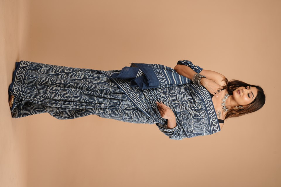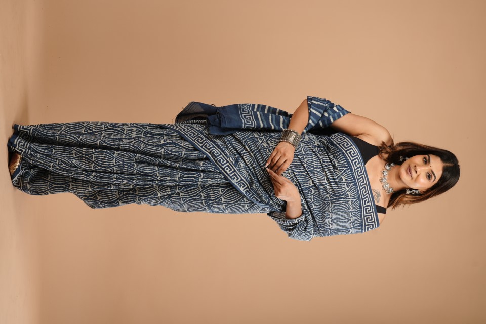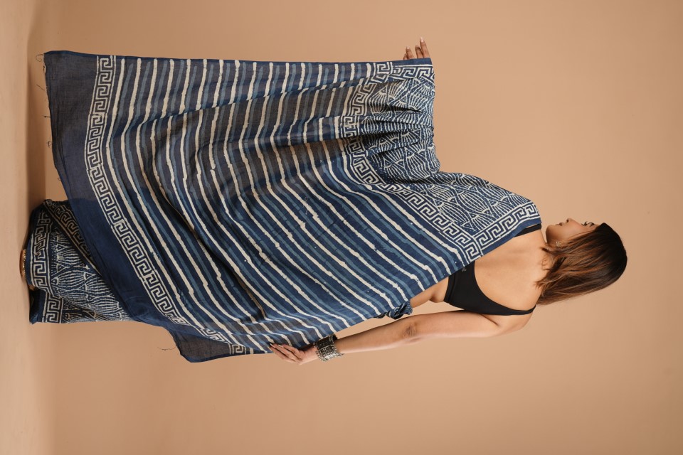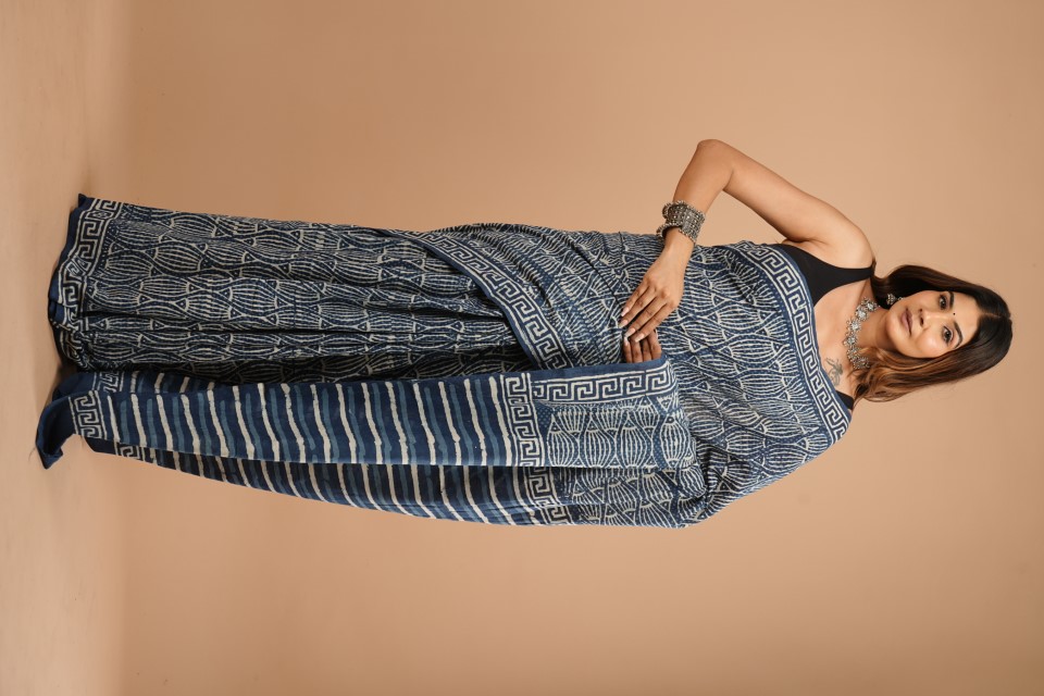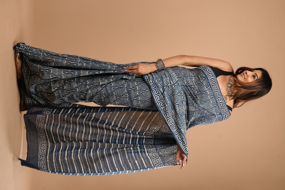 The saree in the image is primarily blue and black with white patterns. It's a block-printed saree with intricate designs like geometric patterns (Greek key motifs) and leaf-like patterns. The saree has a mix of patterns including stripes on one part. The woman is wearing it with a black sleeveless top and accessorized with silver jewellery like a necklace and bangles.
