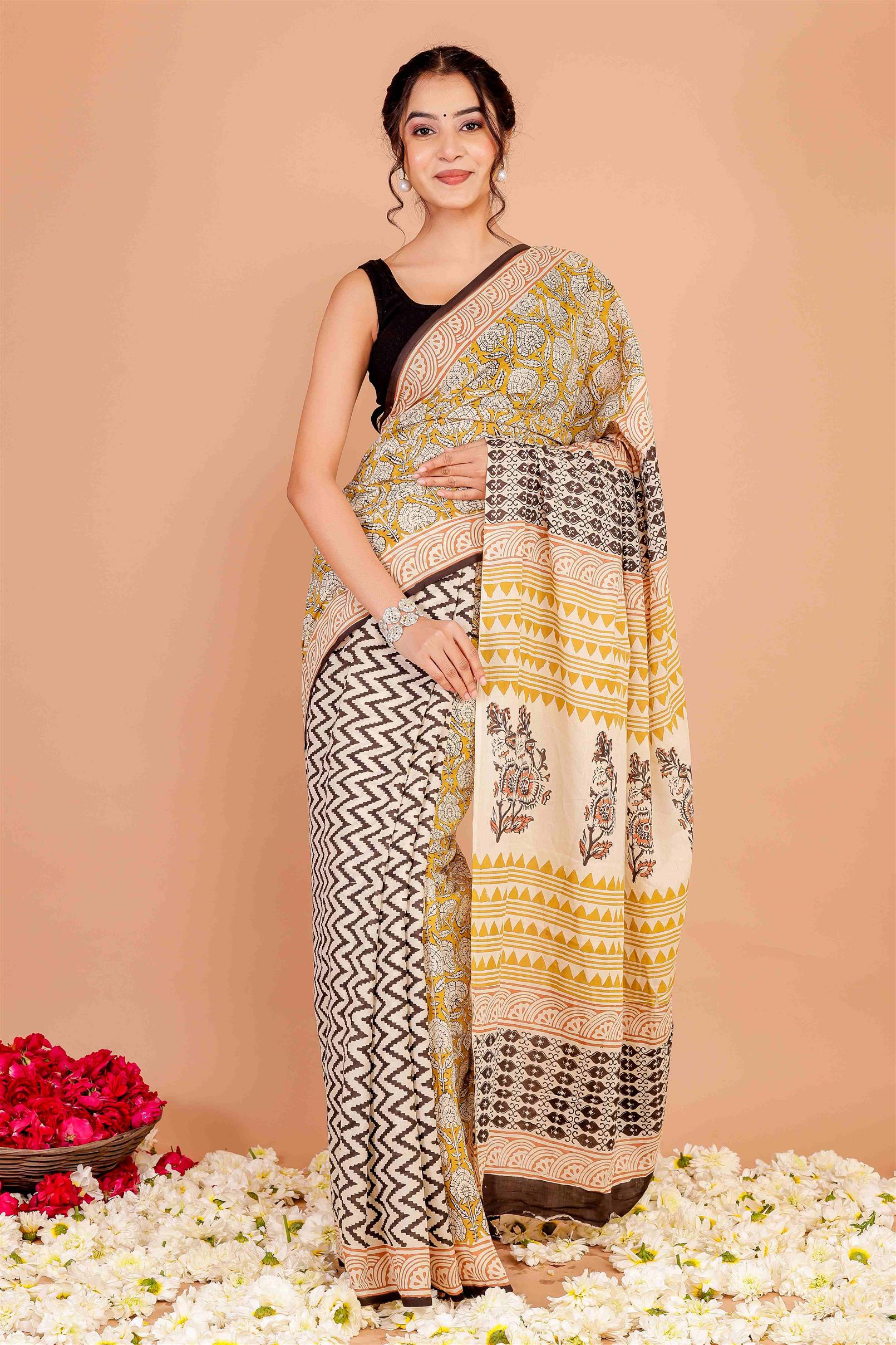 The image shows a woman wearing a traditional Indian saree with a mix of black, white, yellow, and brown colours. The saree has various patterns like zigzags, floral motifs, and geometric designs. She's standing on a floor scattered with white flowers, with a basket of red flowers beside her against a peach-coloured background. ??
