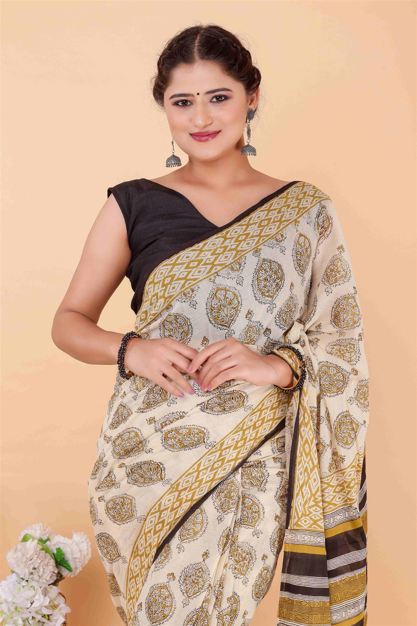 The saree in the image is primarily off-white with intricate patterns in gold, brown, and black. It has a mix of geometric and floral designs, with a striking border featuring stripes and patterns in brown, gold, and white. The blouse is black, adding a chic contrast to the overall look ??.