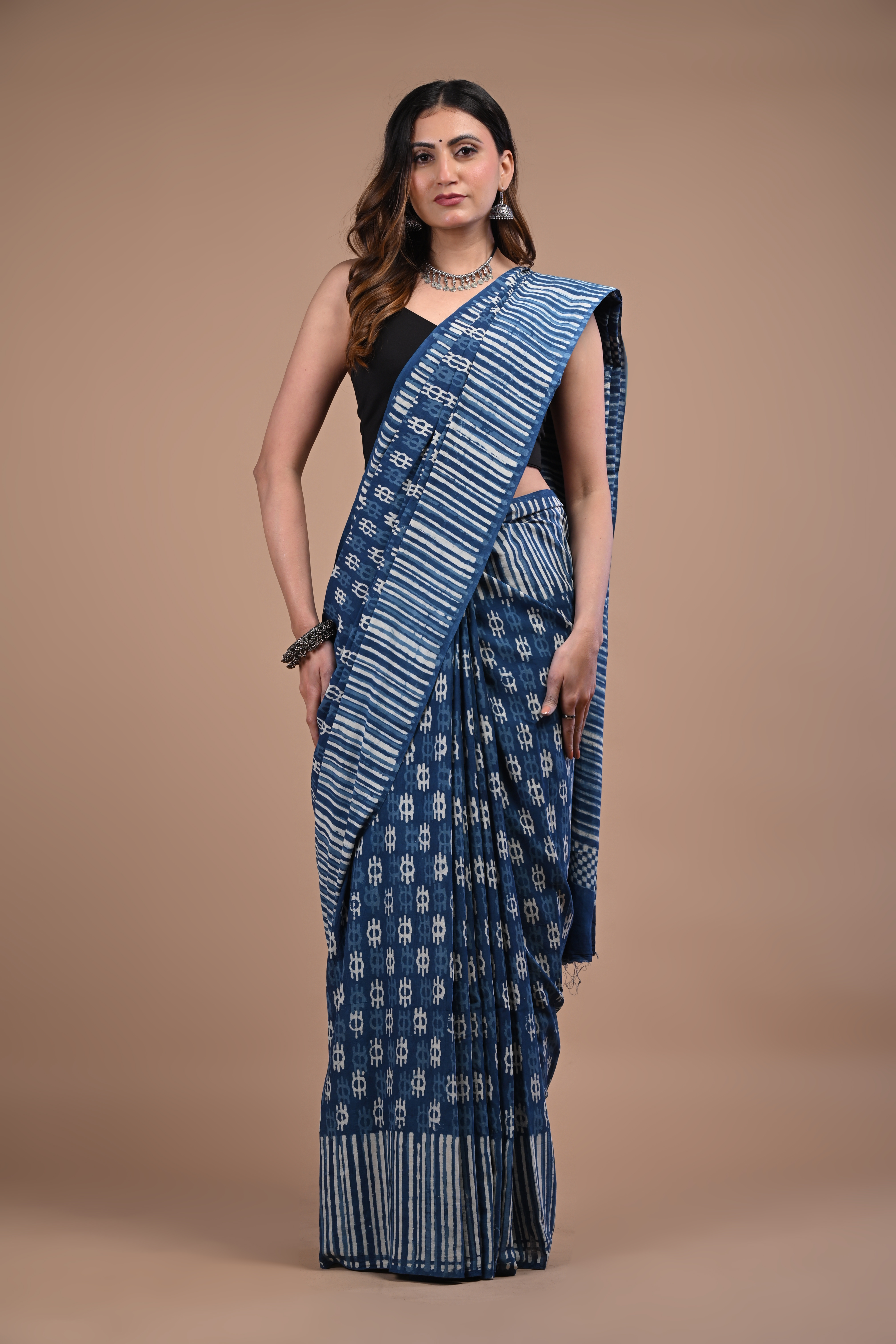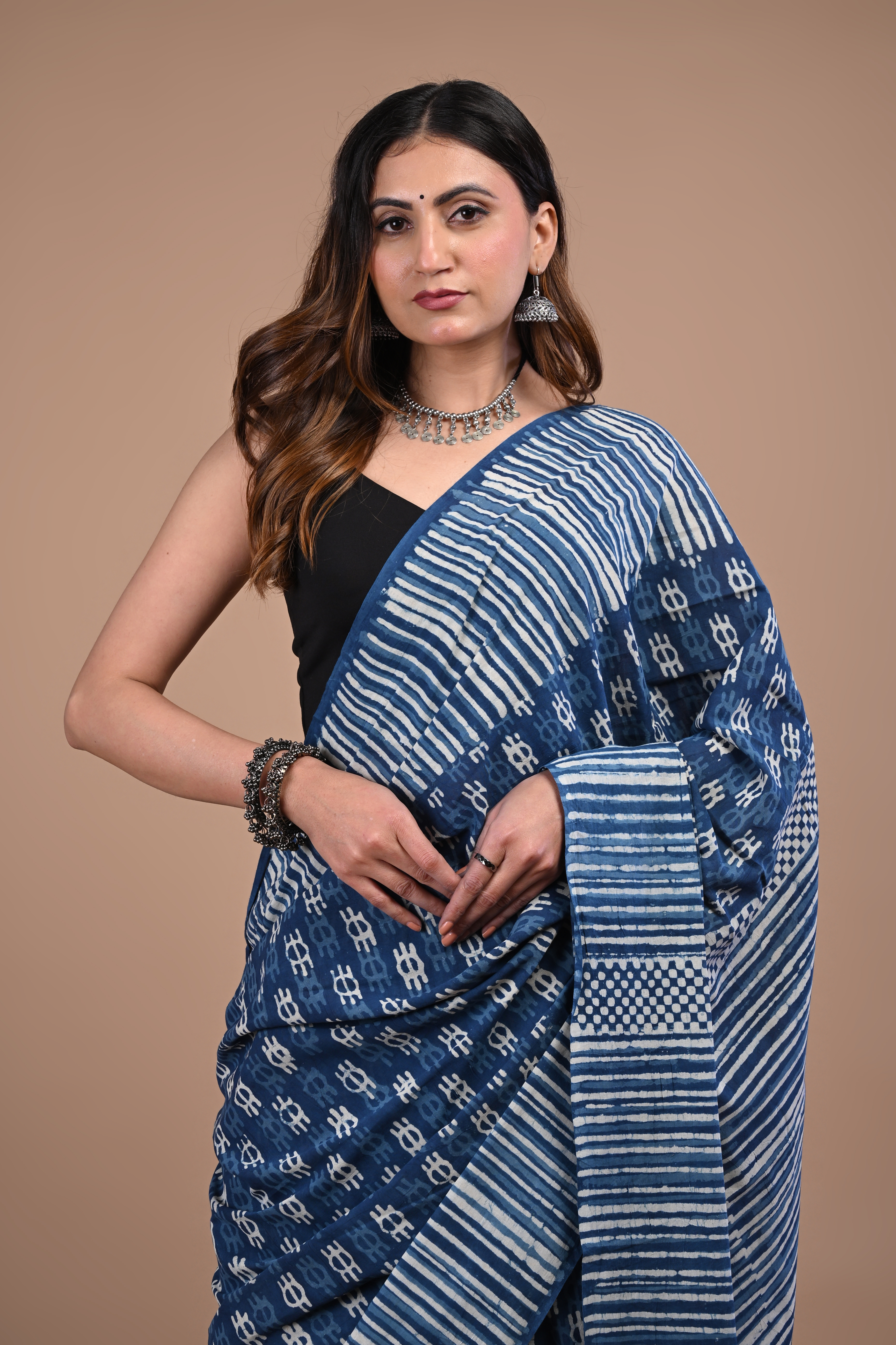 A woman wearing a deep indigo blue saree with white handblock-style geometric and striped patterns, paired with a black sleeveless blouse. The saree features alternating sections of fine stripes and small traditional motifs, along with a subtle patterned border. She accessorizes with oxidized silver jewelry, including a choker necklace, jhumka-style earrings, and stacked bangles, creating a look that feels earthy, elegant, and rooted in traditional Indian craftsmanship with a modern touch.