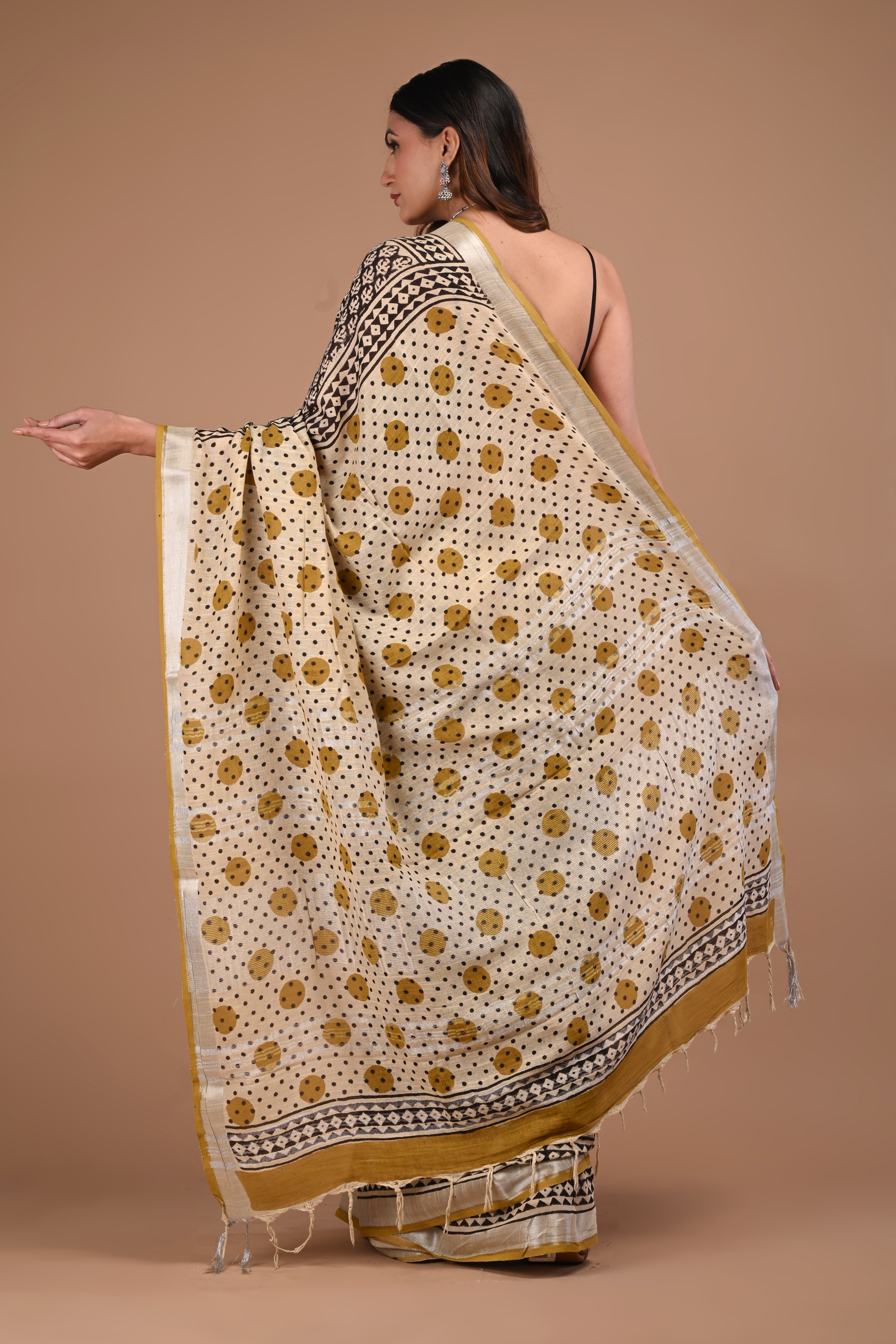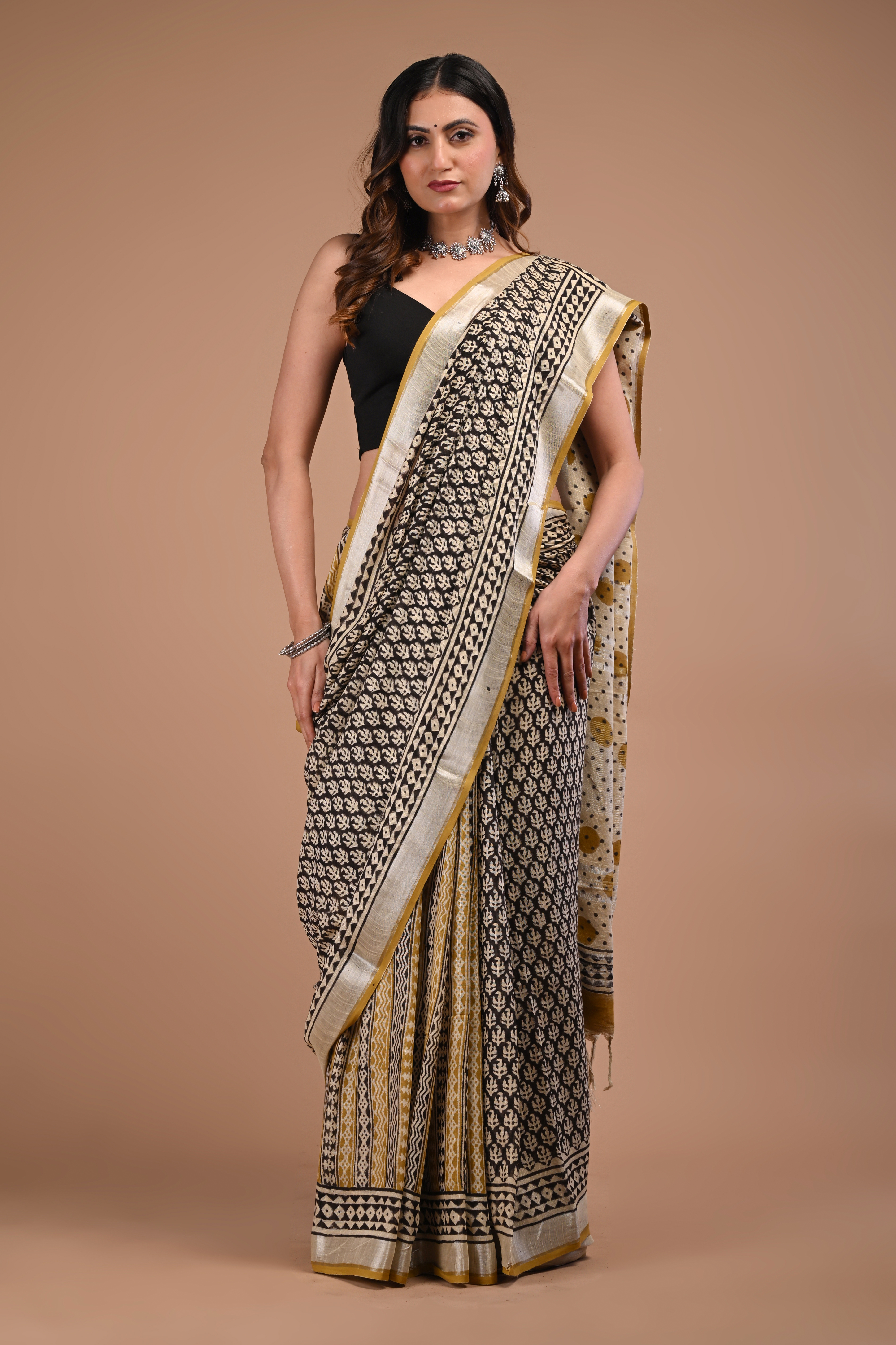 Midnight Ivory Heritage Cotton Linen Saree Elevate your ethnic wardrobe with this timeless Black and Ivory Cotton Linen Saree, beautifully enhanced with a subtle mustard gold border. Crafted from breathable cotton linen fabric, this saree offers the perfect blend of comfort and elegance. The intricate traditional prints add a graceful charm, making it ideal for festive gatherings, office wear, and casual celebrations. Lightweight and easy to drape, this saree ensures all-day comfort while maintaining a sophisticated look. Pair it with a black or mustard blouse and statement silver jewellery for a refined ethnic appeal.
