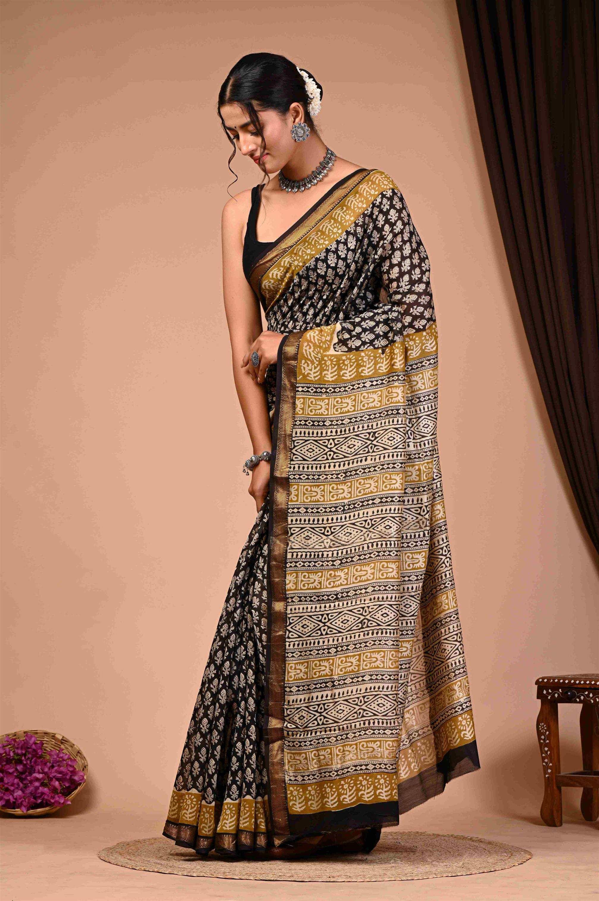 The saree is black with intricate gold and silver patterns, featuring a gold border that adds to its elegance. The fabric is adorned with a mix of geometric and floral designs, creating a sophisticated and traditional look.