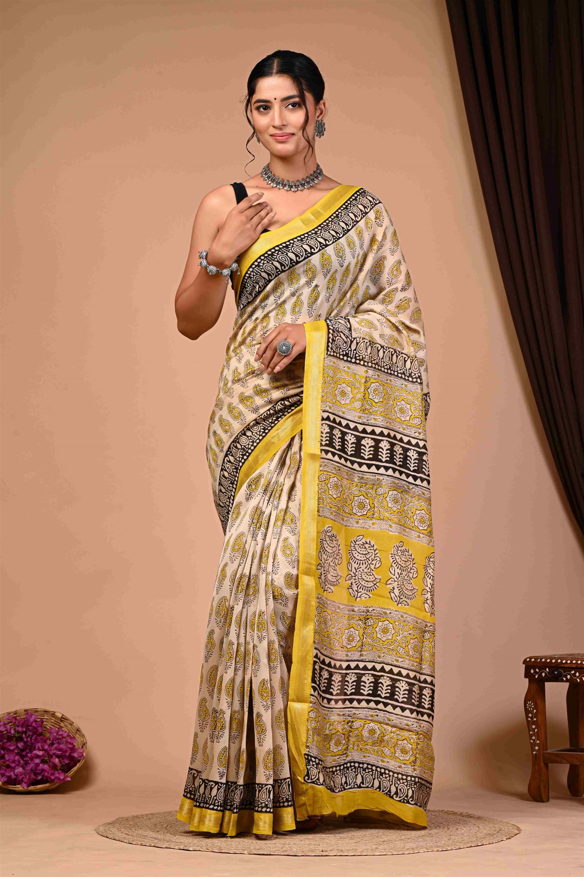 WOMENS PRIMARILY YELLOW AND BLACK MAHESHWARI SILK SAREE