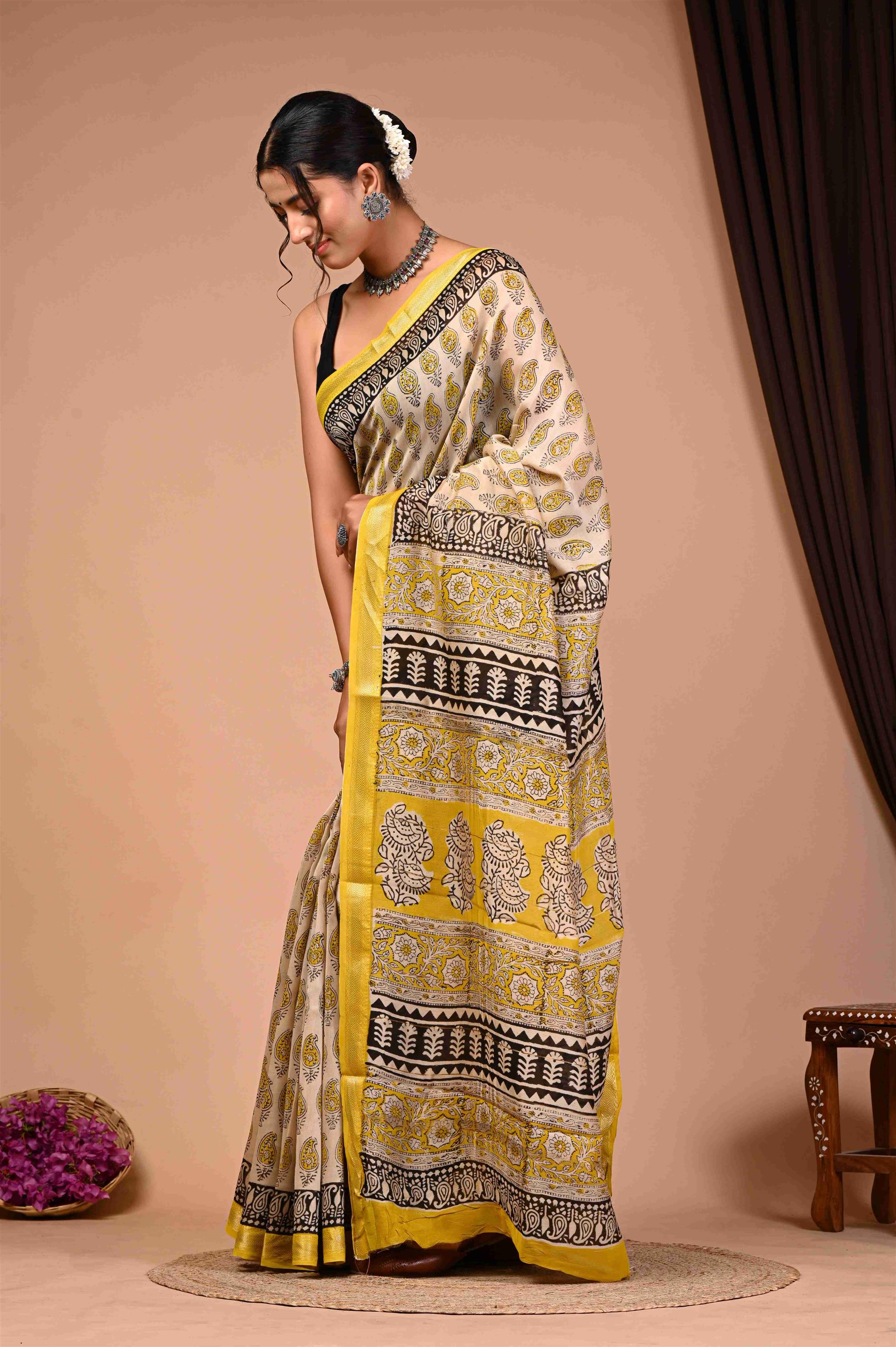 The saree is a beige-colored garment with intricate yellow and black patterns. It features a yellow border with black and white designs, and is draped elegantly around the woman's body. The saree has a classic and traditional Indian design, with a mix of floral and geometric patterns. The beige and yellow colors give it a warm and earthy tone, while the black accents add a touch of sophistication.