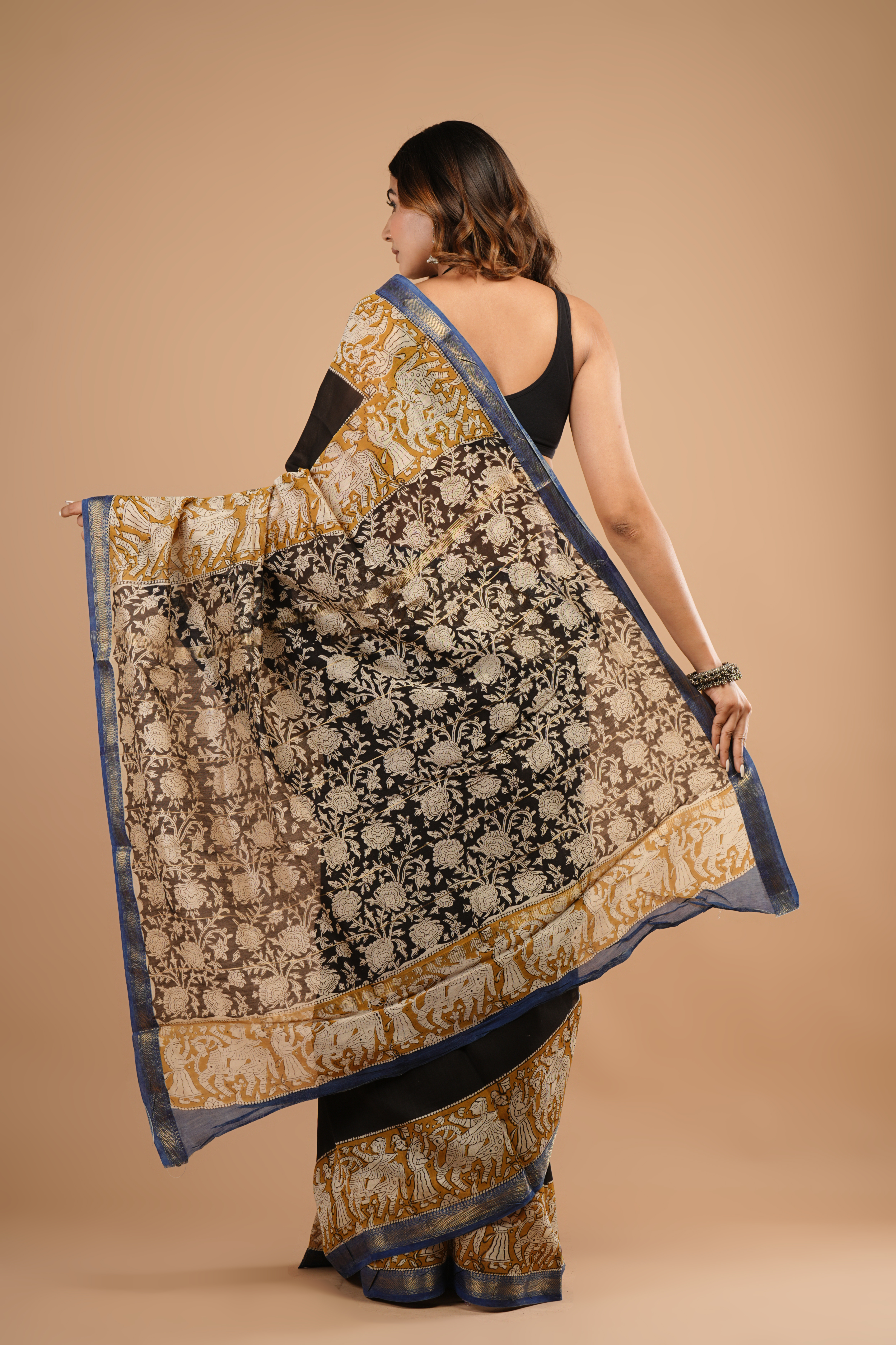 Midnight Royal Maheshwari Silk Saree Elevate your ethnic wardrobe with this elegant Black Maheshwari Silk Saree, beautifully crafted with traditional weaving. The deep black base is complemented by an antique gold zari woven border featuring intricate elephant motifs, symbolizing heritage and grace. A subtle royal blue border accent enhances the richness of the saree, making it perfect for festive occasions and cultural celebrations. The lightweight and breathable Maheshwari silk fabric offers comfort along with timeless elegance. The beautifully designed pallu with detailed floral patterns adds a royal touch, making this saree an ideal choice for weddings, festive gatherings, and special occasions. Fabric : Maheshwari Silk Colour : Deep Black with Antique Gold & Royal Blue Border Work : Traditional Woven Zari Design Occasion: Festive | Wedding | Traditional Wear