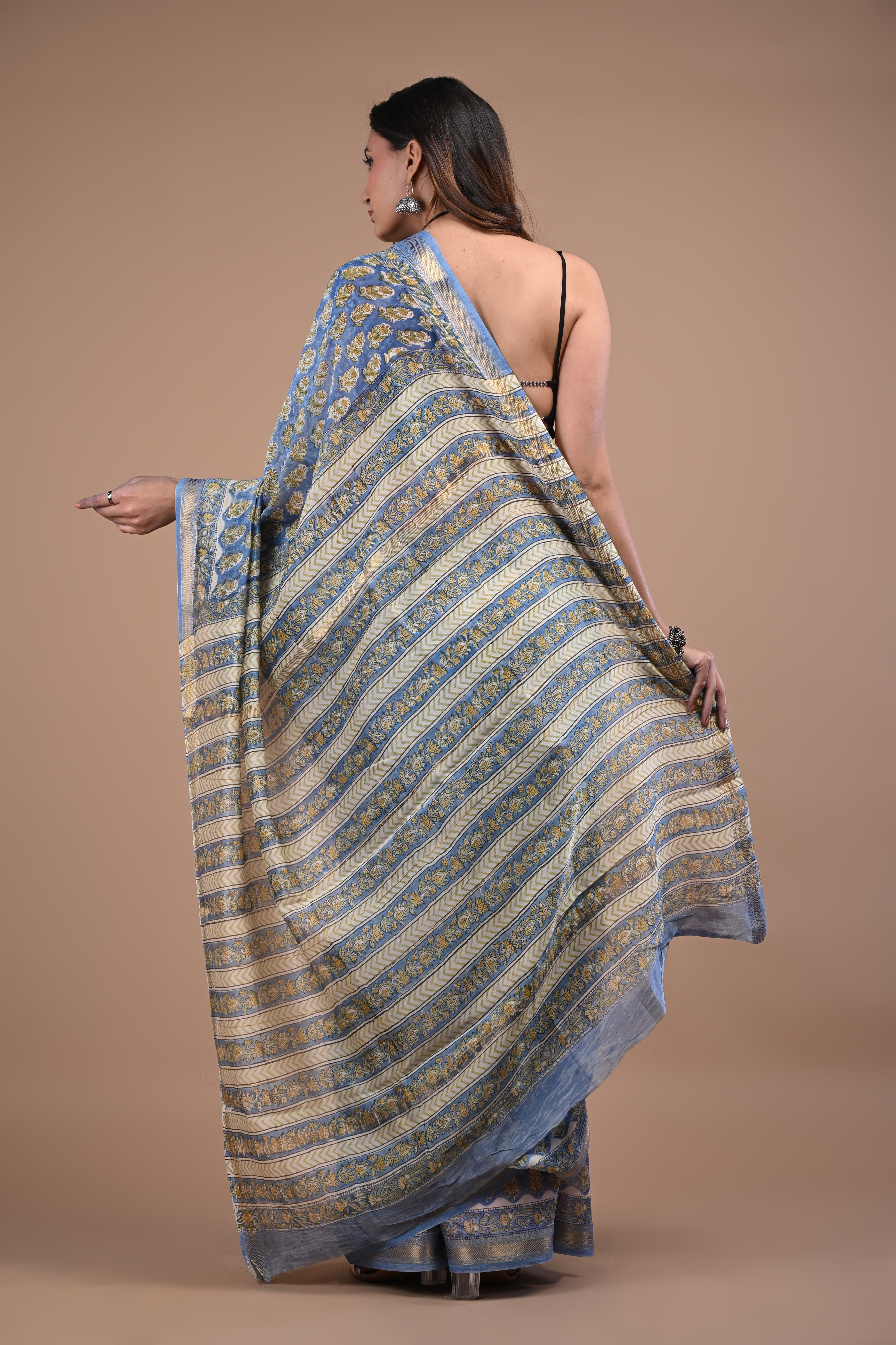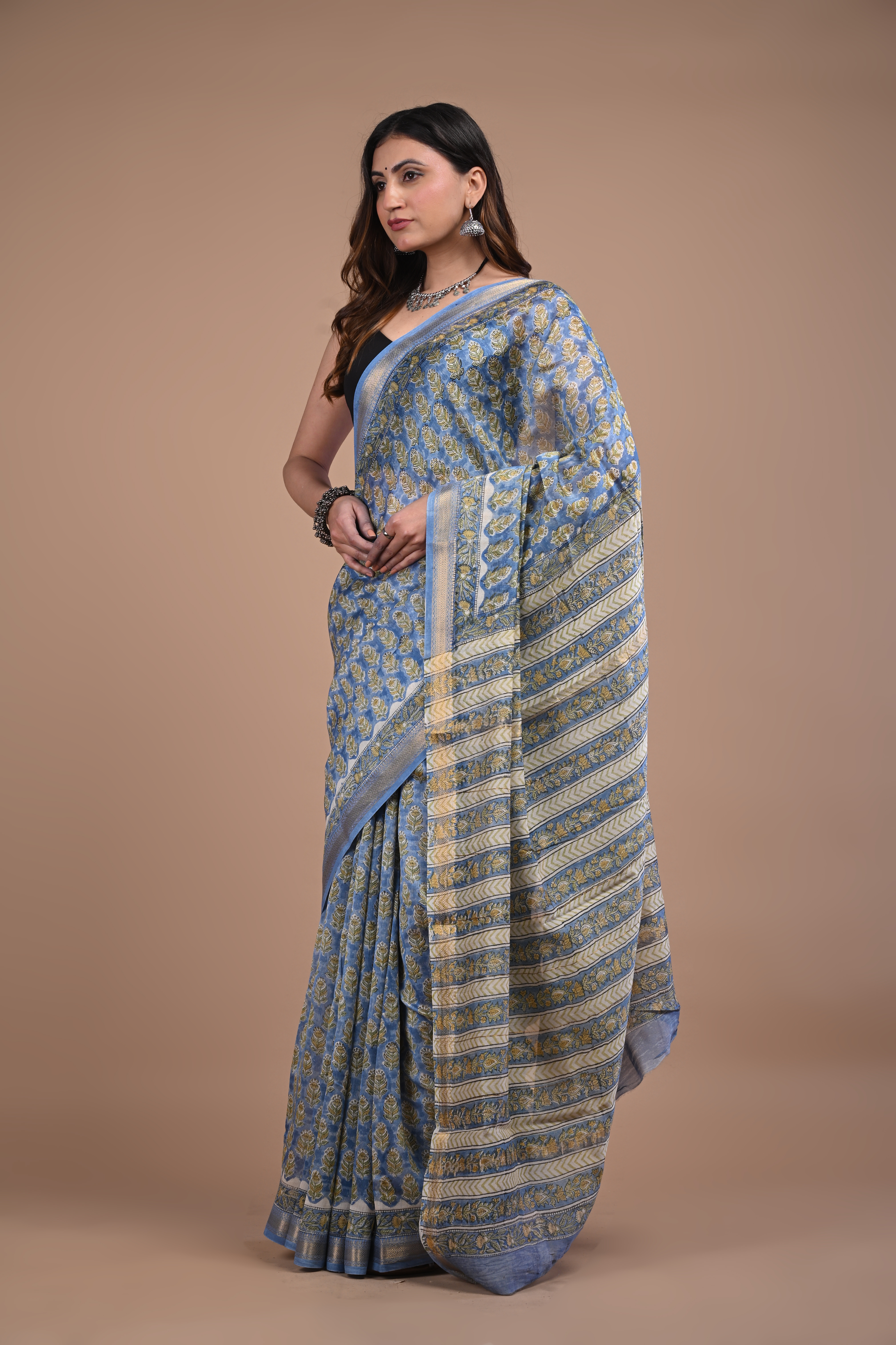 Graceful and sophisticated, this Sky Blue Gold Buti Maheshwari Silk Saree features delicate gold floral motifs beautifully woven across a soft blue base. Crafted from lightweight Maheshwari silk, it offers a smooth texture and elegant drape that enhances its timeless charm. The finely detailed gold border and pallu add a touch of traditional richness, making it perfect for festive celebrations, cultural gatherings, and elegant day occasions. Pair it with classic jewelry for a refined ethnic look.