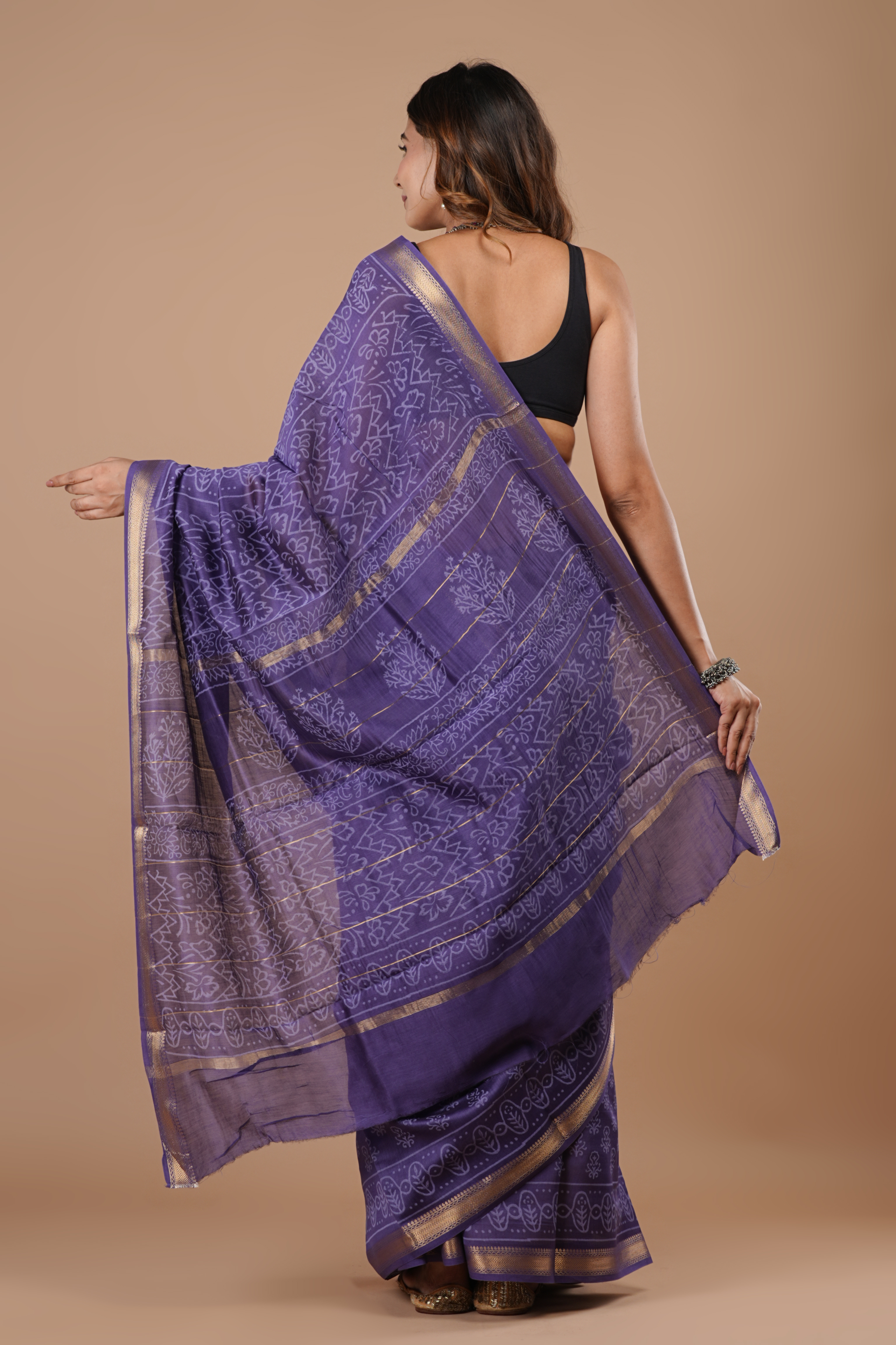 Royal Purple Printed Maheshwari Silk Saree, featuring delicate traditional motifs beautifully spread across a rich purple base. Crafted from lightweight Maheshwari silk, the saree offers a soft texture and graceful drape. The subtle antique gold border enhances its classic appeal, making it an ideal choice for festive celebrations, cultural gatherings, and elegant evening occasions.