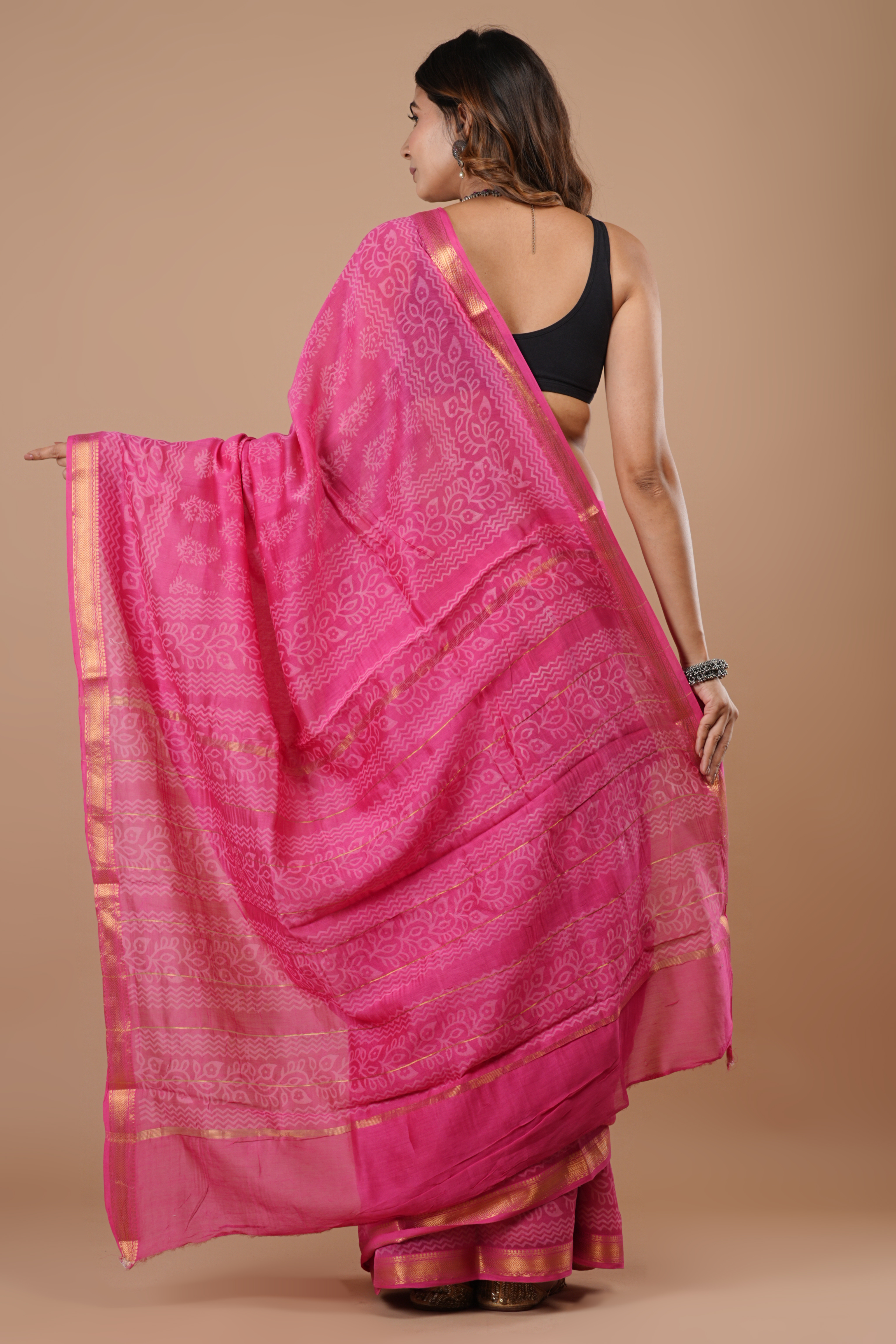 A vibrant Rani Pink Maheshwari silk saree featuring subtle traditional motifs and a classic gold border, perfect for festive and ethnic occasions.