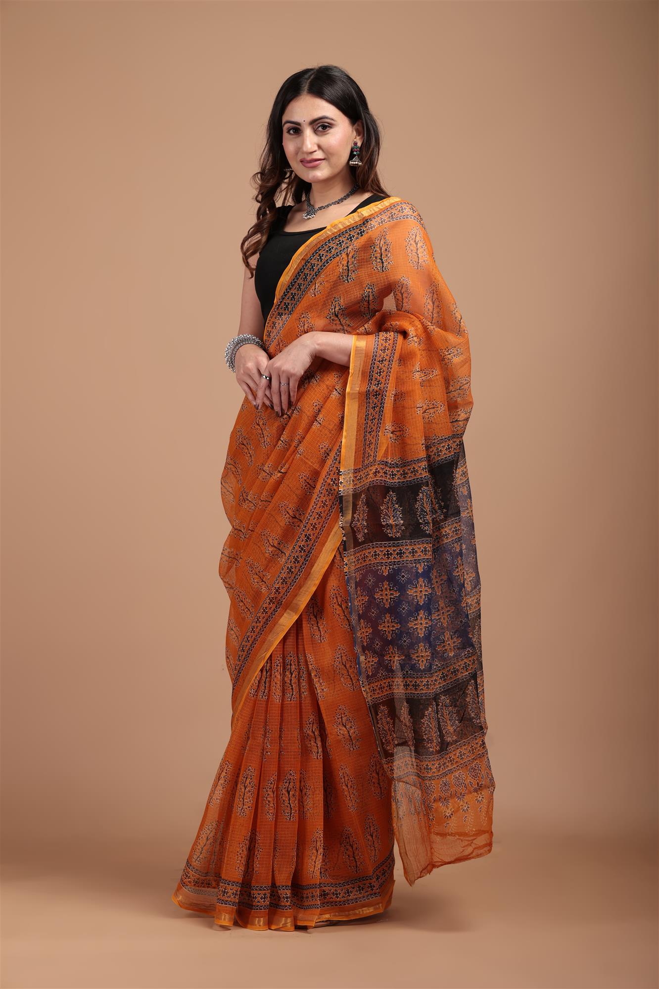 Printed pure Kota doriya saree with golden border (With blouse ) Saree-5.5 mtr Blouse -0.80cm