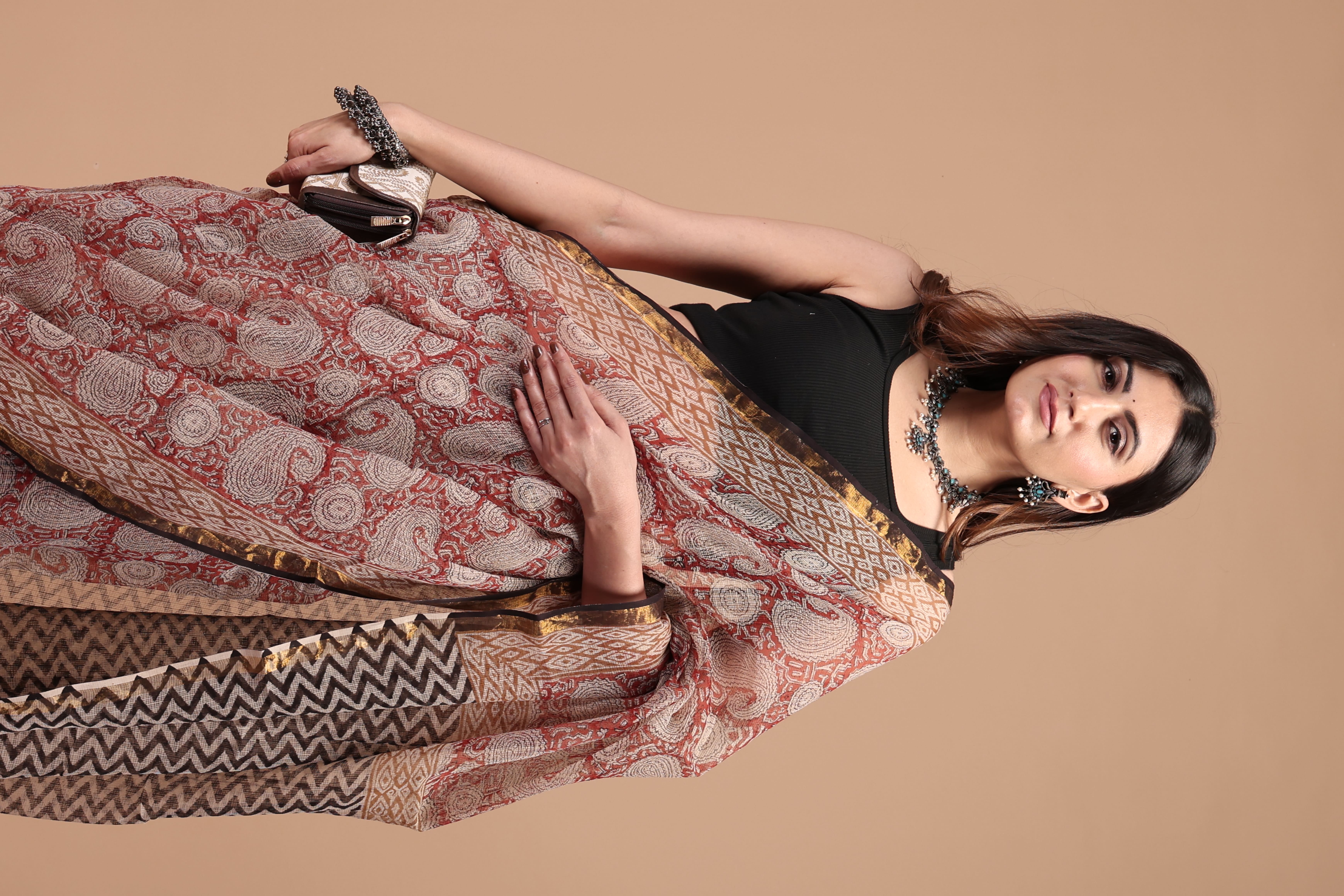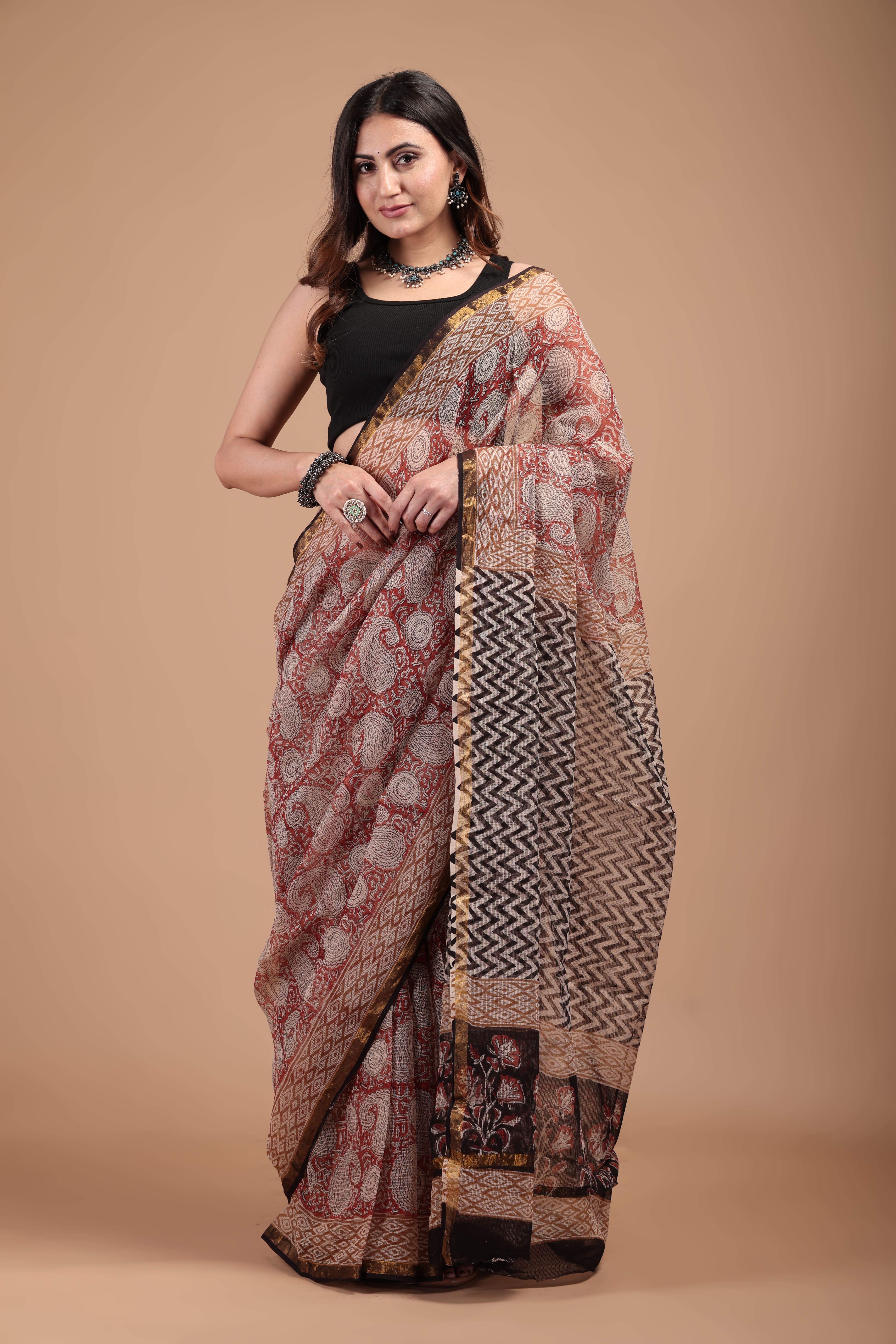 Printed pure Kota doriya saree with golden border (With blouse ) Saree-5.5 mtr Blouse -0.80cm