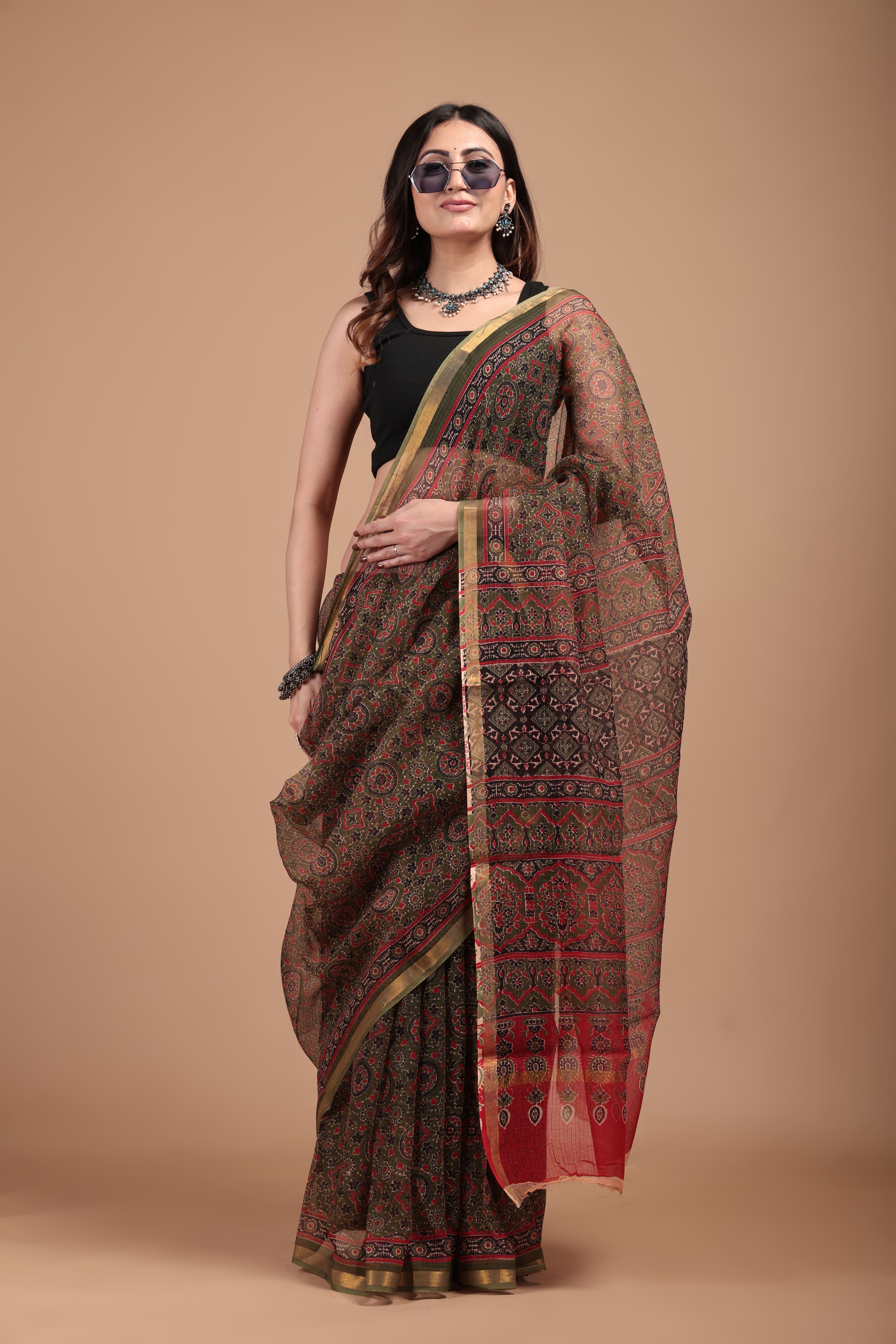 Printed pure Kota doriya saree with golden border (With blouse ) Saree-5.5 mtr Blouse -0.80cm