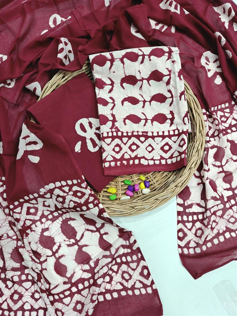Maroon Traditional Block Print Cotton Suit with Mulmul Dupatta